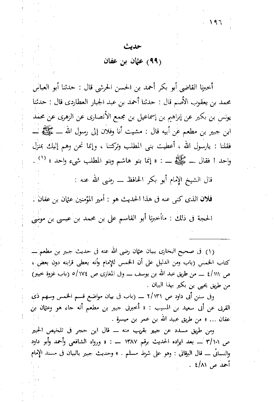 أَخْبَرَنَا الْقَاضِي أَبُو بَكْرٍ أَحْمَدُ بْنُ الْحَسَنِ الْحَرْشِيُّ قَالَ: حَدَّثَنَا أَبُو الْعَبَّاسِ مُحَمَّدُ بْنُ يَعْقُوبَ الأَصَمُّ قَالَ: حَدَّثَنَا أَحْمَدُ بْنُ عَبْدِ الْجَبَّارِ الْعُطَارِدِيُّ قَالَ: حَدَّثَنَا يُونُسُ بْنُ بُكَيْرٍ عَنْ إِبْرَاهِيمَ بْنِ إِسْمَاعِيلَ بْنِ مُجَمِّعٍ الأَنْصَارِيُّ عَنِ الزُّهْرِيِّ عَنْ محمد ابن جُبَيْرِ بْنِ مُطِعْمٍ عَنْ أَبِيهِ قَالَ: مَشَيْتُ أَنَا وَفُلانٌ إِلَى رَسُولُ اللَّهِ - صَلَّى اللَّهُ عَلَيْهِ وَسَلَّم َ - فَقُلْنَا: يَا رَسُولَ اللَّهِ، أَعْطَيْتَ بَنِي الْمُطَّلِبِ وَتَرَكْتَنَا، وَإِنَّمَا نَحْنُ وَهُمْ إِلَيْكَ بِمَنْزِلٍ وَاحَدٍ! فَقَالَ - صَلَّى اللَّهُ عَلَيْهِ وَسَلَّم َ -: " إِنَّمَا بَنُو هَاشِمٍ وَبَنُو الْمُطَلَّبِ شَيْءٌ وَاحِدٌ ".