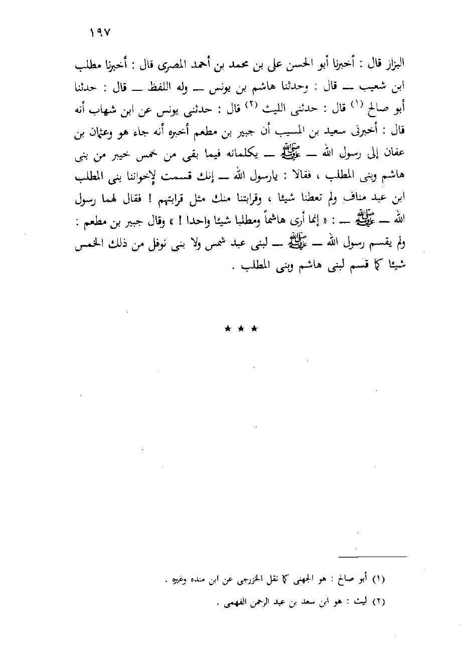 الْبَزَّازُ قَالَ: أَخْبَرَنَا أَبُو الْحَسَنِ عَلِيُّ بْنُ مُحَمَّدِ بْنِ أَحْمَدَ المصري قال: أخبرنا مطلب ابن شُعَيْبٍ - قَالَ: وَحَدَّثَنَا هَاشِمُ بْنُ يُونُسَ - وَلَهُ اللَّفْظُ - قَالَ: حَدَّثَنَا أَبُو صَالِحٍ قَالَ: حَدَّثَنِي اللَّيْثُ قَالَ: حَدَّثَنِي يُونُسُ عَنِ ابْنِ شِهَابٍ أَنَّهُ قَالَ: أَخْبَرَنِي سَعِيدُ بْنُ الْمُسَيِّبِ أَنَّ جُبَيْرَ بْنَ مُطْعِمٍ أَخْبَرَهُ أَنَّهُ جَاءَ هُوَ وَعُثْمَانُ بْنُ عَفَّانَ إِلَى رَسُولِ اللَّهِ - صَلَّى اللَّهُ عَلَيْهِ وَسَلَّم َ - يُكَلِّمَانِهِ فِيمَا بَقِيَ مِنْ خُمْسِ خَيْبَرَ مِنْ بَنِي هَاشِمٍ وَبَنِي الْمُطَّلِبِ، فَقَالا: يَا رَسُولَ اللَّهِ - إِنَّكَ قَسَّمْتَ لإِخْوَانِنَا بَنِي الْمُطَّلِبِ ابن عَبْدِ مَنَافٍ وَلَمْ تُعْطِنَا شَيْئًا، وَقَرَابَتُنَا مِنْكَ مِثْلُ قَرَابَتِهِمْ {فَقَالَ لَهُمَا رَسُولُ اللَّهِ - صَلَّى اللَّهُ عَلَيْهِ وَسَلَّم َ -: " إِنَّمَا أَرَى هَاشِمًا وَمُطَّلِبًا شَيْئًا وَاحِدًا} " وَقَالَ جُبَيْرُ بْنُ مُطْعِمٍ: وَلَمْ يُقَسِّمُ رَسُولُ اللَّهِ - صَلَّى اللَّهُ عَلَيْهِ وَسَلَّم َ - لَبَنِي عَبْدِ شَمْسٍ وَلا بَنِي نَوْفَلٍ مِنْ ذَلِكَ الْخُمْسِ شَيْئًا كَمَا قَسَّمَ لِبَنِي هَاشِمٍ وَبَنِي المطلب.