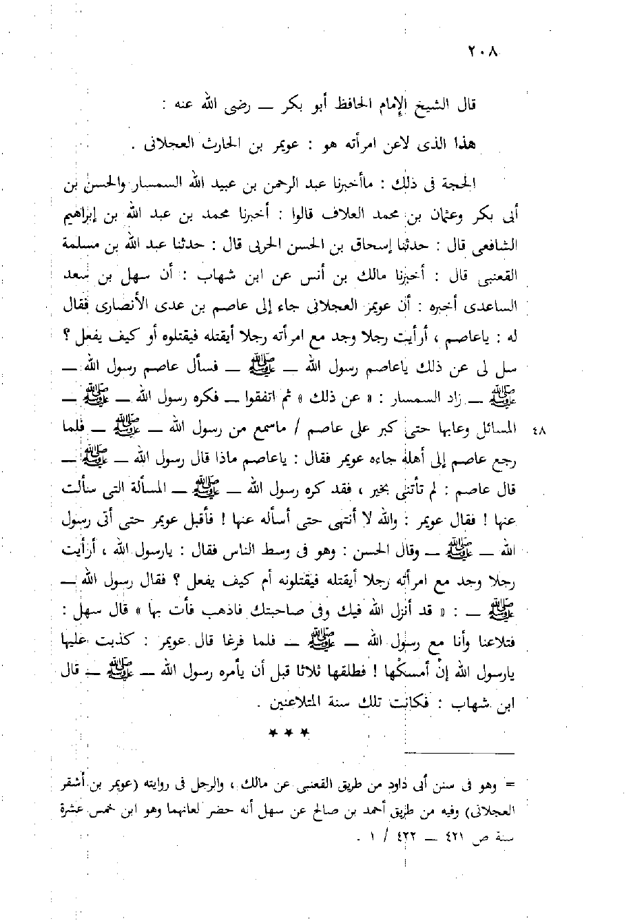 قَالَ الشَّيْخ الْإِمَام الْحَافِظُ أَبُو بَكْرٍ - رَضِيَ اللَّهُ عَنْهُ: هَذَا الَّذِي لاعَنَ امْرَأَتَهُ هُوَ: عُوَيْمِرُ بْنُ الْحَارِثِ الْعَجْلانِيُّ.