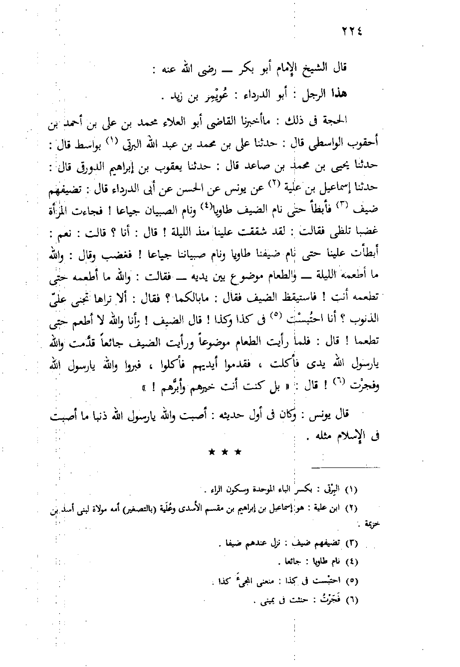 الحجة في ذلك: مَا أَخْبَرَنَا الْقَاضِي أَبُو الْعَلاءِ مُحَمَّدُ بْنُ عَلِيِّ بْنِ أَحْمَدَ بْنِ أُحْقُوبٍ الْوَاسِطِيُّ قَالَ: حَدَّثَنَا عَلِيُّ بْنُ مُحَمَّدِ بْنِ عَبْدِ اللَّهِ الْبِرْتِيُّ بِوَاسِطٍ قَالَ: حَدَّثَنَا يَحْيَى بْنُ مُحَمَّدِ بْنِ صَاعِدٍ قَالَ: حَدَّثَنَا يَعْقُوبُ بْنُ إِبْرَاهِيمَ الدَّوْرَقِيُّ قَالَ: حَدَّثَنَا إِسْمَاعِيلُ بْنُ عُلَيَّةَ عَنْ يُونُسَ عَنِ الْحَسَنِ عَنْ أَبِي الدَّرْدَاءِ قَالَ: تَضَيَّفَهُمْ ضَيْفٌ فَأَبْطَأَ حَتَّى نَامَ الضَّيْفُ طَاوِيًا وَنَامَ الصِّبْيَانُ جِيَاعًا {فَجَاءَتِ الْمَرْأَةُ غَضَبًا تَلَظَّى فَقَالَتْ: لَقَدْ شَقَقْتَ عَلَيْنَا مُنْذُ اللَّيْلَةَ} قَالَ: أَنَا؟ قَالَتْ: نَعَمْ: أَبْطَأْتَ عَلَيْنَا حَتَّى نَامَ ضَيْفَنَا طَاوِيًا وَنَامَ صِبْيَانُنَا جِيَاعًا {فَغَضِبَ وَقَالَ: وَاللَّهِ مَا أَطْعَمُهُ اللَّيْلَةَ - وَالطَّعَامُ مَوْضُوعٌ بَيْنَ يَدَيْهِ - فَقَالَتْ: وَاللَّهِ مَا أَطْعَمُهُ حَتَّى تطعمه أنت} فاستيقظ الضيف قال: مَا بَالُكُمَا؟ فَقَالَ: أَلا تَرَاهَا تَجْنِي عَلَيَّ الذُّنُوبَ؟ أَنَا احْتُبِسْتُ فِي كَذَا وَكَذَا {قَالَ الضَّيْفُ} وَأَنَا وَاللَّهِ لا أَطْعَمُ حَتَّى تَطْعَمَا {قَالَ: فَلَمَّا رَأَيْتُ الطَّعَامَ مَوْضُوعًا وَرَأَيْتُ الضَّيْفَ جَائِعًا قَدَّمْتُ وَاللَّهِ يَا رَسُولَ اللَّهِ يَدِي فَأَكَلْتُ، فَقَدَّمُوا أَيْدِيَهُمْ فَأَكَلُوا، فَبَرُّوا وَاللَّهِ يَا رَسُول اللَّهِ وَفَجَرْتُ} قَالَ: " بَلْ كُنْتَ أَنْتَ خَيْرَهُمْ وَأَبَرَّهُمْ! "