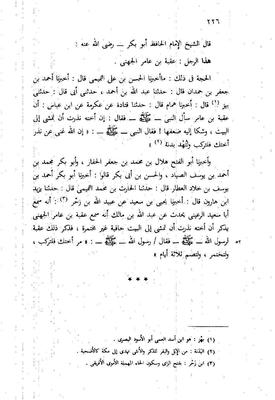 وَأَخْبَرَنَا أَبُو الْفَتْحِ هِلالُ بْنُ مُحَمَّدِ بْنِ جَعْفَرٍ الْحَفَّارِ، وَأَبُو بَكْرٍ مُحَمَّدُ بْنُ أَحْمَدَ بْنِ يُوسُفَ الصَّيَّادُ، وَالْحَسَنُ بْنُ أَبِي بَكْرٍ قَالُوا: أَخْبَرَنَا أَبُو بَكْرٍ أَحْمَدُ بْنُ يُوسُفَ بْنِ خَلادٍ الْعَطَّارُ قَالَ: حَدَّثَنَا الْحَارِثُ بْنُ مُحَمَّدٍ التميمي قال: حدثنا يزيد ابن هَارُونَ قَالَ: أَخْبَرَنَا يَحْيَى بْنُ سَعِيدٍ عَنْ عُبَيْدِ اللَّهِ بْنِ زَحْرٍ: أَنَّهُ سَمِعَ أَبَا سَعِيدٍ الرُّعَيْنِيُّ يُحَدِّثُ عَنْ عَبْدِ اللَّهِ بْنِ مَالِكٍ أَنَّهُ سَمِعَ عُقْبَةَ بْنَ عَامِرٍ الْجُهَنِيُّ يَذْكُرُ أَنَّ أُخْتَهُ نَذَرَتْ أَنْ تَمْشِيَ إِلَى الْبَيْتِ حَافِيَةً غَيْرَ مُخْتَمِرَةً، فَذَكَرَ ذَلِكَ عُقْبَةُ لِرَسُولِ اللَّهِ - صَلَّى اللَّهُ عَلَيْهِ وَسَلَّم َ - فَقَالَ / رَسُولُ اللَّهِ - صَلَّى اللَّهُ عَلَيْهِ وَسَلَّم َ -: " مر أختك فلتركب، ولتختمر، ولتصم ثلاثة أيام ".