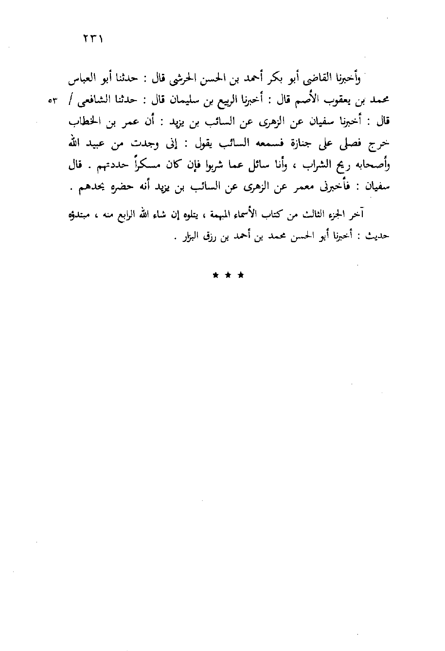 آخر الجزء الثالث من كتاب الأسماء المبهمة، يتلوه إن شاء اللَّه الرابع منه، مبتدؤه حديث: أَخْبَرَنَا أَبُو الْحَسَنِ مُحَمَّدُ بْنُ أَحْمَدَ بْنِ رزق البزار.