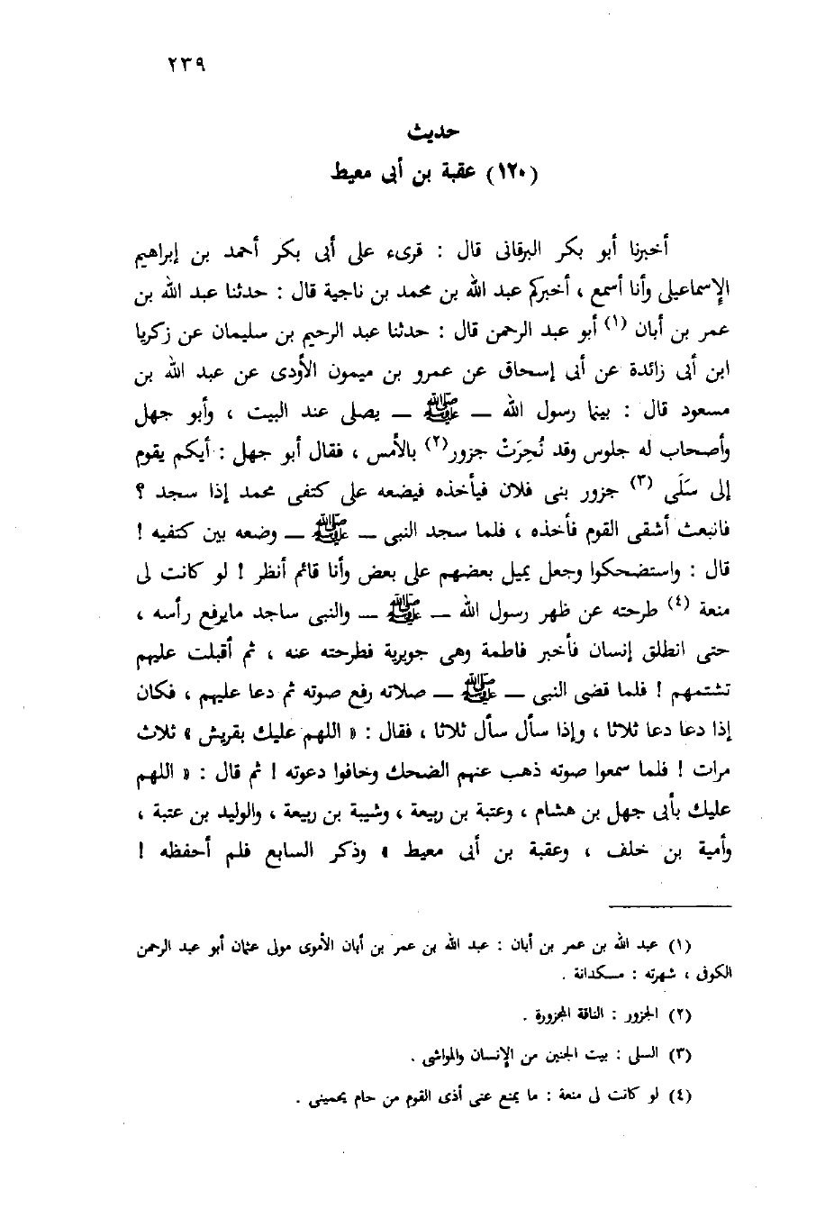 أَخْبَرَنَا أَبُو بَكْرٍ الْبَرْقَانِيُّ قَالَ: قُرِئَ عَلَى أَبِي بَكْرٍ أَحْمَدُ بْنُ إِبْرَاهِيمَ الإِسْمَاعِيلِيِّ وَأَنَا أَسْمَعُ، أَخْبَرَكُمْ عَبْدُ اللَّهِ بْنُ مُحَمَّدِ بْنِ نَاجِيَةَ قَالَ: حَدَّثَنَا عَبْدُ اللَّهِ بْنُ عُمَرَ بْنِ أَبَانٍ أَبُو عَبْدِ الرَّحْمَنِ قَالَ: حَدَّثَنَا عَبْدُ الرَّحِيمِ بن سليمان عن زكريا ابن أَبِي زَائِدَةَ عَنْ أَبِي إِسْحَاقَ عَنْ عَمْرِو بْنِ مَيْمُونٍ الأَوَدِيِّ عَنْ عَبْدِ اللَّهِ بْن مَسْعُود قَالَ: بَيْنَمَا رَسُولُ اللَّهِ - صَلَّى اللَّهُ عَلَيْهِ وَسَلَّم َ - يُصَلِّي عِنْدَ الْبَيْتِ، وَأَبُو جَهْلٍ وَأَصْحَابٌ لَهُ جُلُوسٌ وَقَدْ نُحِرَتْ جَزُورٌ بِالأَمْسِ، فَقَالَ أَبُو جَهْلٍ: أَيُّكُمْ يَقُومُ إِلَى سَلَى جَزُورِ بَنِي فُلانٍ فَيَأْخُذُهُ فَيَضَعُهُ عَلَى كَتِفَيْ مُحَمَّدٍ إِذَا سَجَدَ؟ فَانْبَعَثَ أَشْقَى الْقَوْمِ فَأَخَذَهُ، فَلَمَّا سَجَدَ النَّبِيِّ - صَلَّى اللَّهُ عَلَيْهِ وَسَلَّم َ - وَضَعَهُ بَيْنَ كَتِفَيْهِ {قَالَ: وَاسْتَضْحَكُوا وَجَعَلَ يَمِيلُ بَعْضُهُمْ عَلَى بَعْضٍ وَأَنَا قَائِمٌ أَنْظُرُ} لَوْ كَانَتْ لِي مَنَعَةٌ طَرَحْتُهُ عَنْ ظَهْرِ رَسُولُ اللَّهِ - صَلَّى اللَّهُ عَلَيْهِ وَسَلَّم َ - وَالنَّبِيُّ سَاجِدٌ مَا يَرْفَعُ رَأْسَهُ، حَتَّى انْطَلَقَ إِنْسَانٌ فَأَخْبَرَ فَاطِمَةَ وَهِيَ جُوَيْرِيَةٌ فَطَرَحَتْهُ عَنْهُ، ثُمَّ أَقْبَلَتْ عَلَيْهِمْ تَشْتُمُهُمْ {فَلَمَّا قَضَى النَّبِيِّ - صَلَّى اللَّهُ عَلَيْهِ وَسَلَّم َ - صَلاتَهُ رَفَعَ صَوْتَهُ ثُمَّ دَعَا عَلَيْهِمْ، فَكَانَ إِذَا دَعَا دَعَا ثَلاثًا، وَإِذَا سَأَلَ سَأَلَ ثَلاثًا، فَقَالَ: " اللَّهُمَّ عَلَيْكَ بِقُرَيْشٍ " ثَلاثَ مَرَّاتٍ} فَلَمَّا سَمِعُوا صَوْتَهُ ذَهَبَ عَنْهُمُ الضَّحِكُ وَخَافُوا دَعْوَتَهُ {ثُمَّ قَالَ: " اللَّهُمَّ عَلَيْكَ بِأَبِي جَهْلِ بْنَ هِشَامٍ، وَعُتْبَةَ بْنَ رَبِيعَةَ، وَشَيْبَةَ بْنِ رَبِيعَةَ، وَالْوَلِيدِ بْنِ عُتْبَةَ، وَأُمَيَّةَ بْنِ خَلَفٍ، وَعُقْبَةَ بْنِ أَبِي مُعَيْطٍ " وَذَكَرَ السَّابِعَ فلم أحفظه}