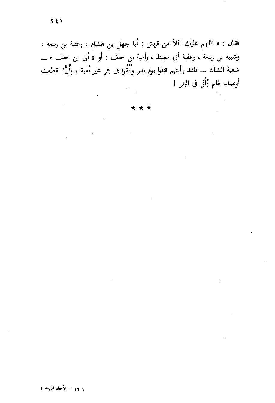 فَقَالَ: " اللَّهُمَّ عَلَيْكَ الْمَلأَ مِنْ قُرَيْشٍ: أَبَا جَهْلِ بْنَ هِشَامٍ، وَعُتْبَةَ بْنِ رَبِيعَةَ، وَشَيْبَةَ بْنِ رَبِيعَةَ، وَعُقْبَةَ أَبِي مُعَيْطٍ، وَأُمَيَّةَ بْنَ خَلَفٍ " أَوْ " أُبَيَّ بْنَ خَلَفٍ " - شُعْبَةُ الشَّاكُّ - فَلَقَدْ رَأَيْتُهُمْ قُتِلُوا يَوْمَ بَدْرٍ وَأُلْقُوا فِي بِئْرِ عِيرِ أُمَيَّةَ، وَأُبَيًّا تَقَطَّعَتْ أَوْصَالُهُ فَلَمْ يُلْقَ فِي الْبِئْرِ!
