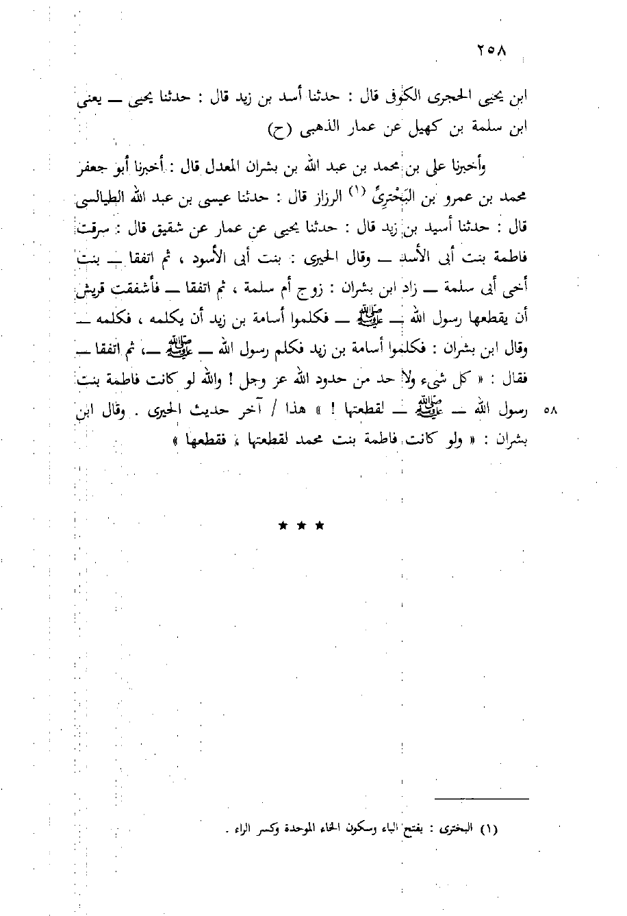 وَأَخْبَرَنَا عَلِيُّ بْنُ مُحَمَّدِ بْنِ عَبْدِ اللَّهِ بْنِ بِشْرَانَ الْمُعَدَّلُ قَالَ: أَخْبَرَنَا أَبُو جَعْفَرٍ مُحَمَّدُ بْنُ عَمْرِو بْنِ الْبُحْتُرِيِّ الرَّزَّازُ قَالَ: حَدَّثَنَا عِيسَى بْنُ عَبْدِ اللَّهِ الطَّيَالِسِيُّ قَالَ: حَدَّثَنَا أُسَيْدُ بْنُ زَيْدٍ قَالَ: حَدَّثَنَا يَحْيَى عَنْ عَمَّارٍ عَنْ شَقِيقٍ قَالَ: سَرَقَتْ فَاطِمَةُ بِنْتُ أَبِي الأَسَدِ - وَقَالَ الْحِيرِيُّ: بِنْتُ أَبِي الأَسْوَدِ، ثُمَّ اتَّفَقَا - بِنْتُ أَخِي أَبِي سَلَمَةَ - زَادَ ابْنُ بِشْرَانَ: زَوْجُ أُمِّ سَلَمَةَ، ثُمَّ اتَّفَقَا - فَأَشْفَقَتْ قُرَيْشٌ أَنْ يَقْطَعَهَا رَسُولُ اللَّهِ - صَلَّى اللَّهُ عَلَيْهِ وَسَلَّم َ - فَكَلَّمُوا أُسَامَةَ بْنَ زَيْدٍ أَنْ يُكَلِّمَهُ، فَكَلَّمَهُ - وَقَالَ ابْنُ بِشْرَانَ: فكَلَمَّوا أُسَامَةَ بْنَ زَيْدٍ فَكَلَّمَ رَسُولُ اللَّهِ - صَلَّى اللَّهُ عَلَيْهِ وَسَلَّم َ -، ثُمَّ اتَّفَقَا - فَقَالَ: " كُلُّ شَيْءٍ وَلا حَدَّ مِنْ حُدُودِ اللَّهِ عَزَّ وَجَلَّ {وَاللَّهِ لَوْ كَانَتْ فَاطِمَةَ بِنْتِ رَسُولِ اللَّهِ - صَلَّى اللَّهُ عَلَيْهِ وَسَلَّم َ - لَقَطَعْتُهَا} " هَذَا / آخِرُ حَدِيثِ الْحِيرِيِّ. وَقَالَ ابْنُ بِشْرَانَ: " وَلَوْ كَانَتْ فَاطِمَةُ بِنْتُ مُحَمَّدٍ لَقَطَعْتُهَا، فَقَطَعَهَا ".