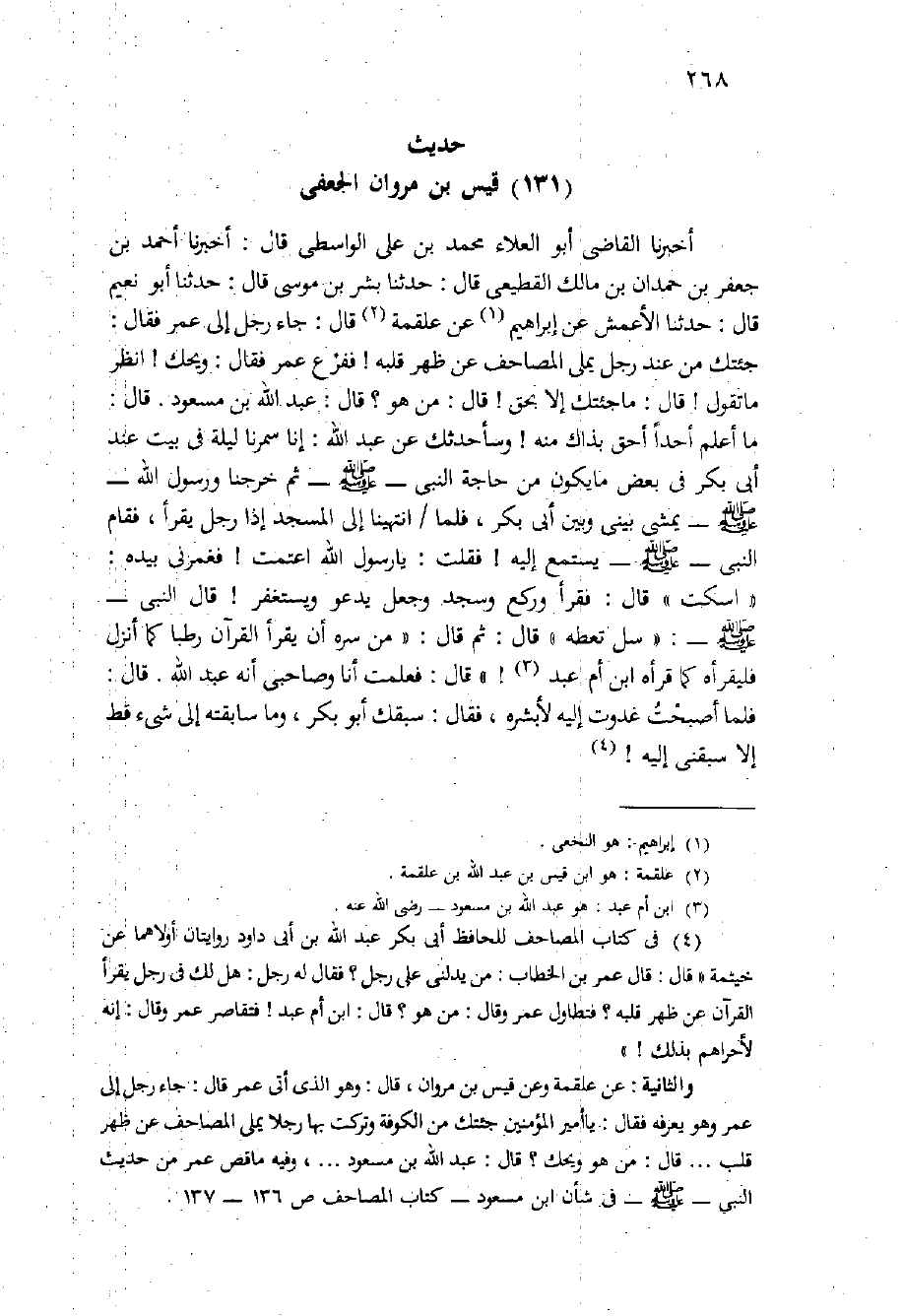 أَخْبَرَنَا الْقَاضِي أَبُو الْعَلاءِ مُحَمَّدُ بْنُ عَلِيِّ الْوَاسِطِيُّ قَالَ: أَخْبَرَنَا أَحْمَدُ بْنُ جَعْفَرِ بْنِ حَمْدَانَ بْنِ مَالِكٍ الْقَطِيعِيُّ قَالَ: حَدَّثَنَا بِشْرُ بْنُ مُوسَى قَالَ: حَدَّثَنَا أَبُو نُعَيْمٍ قَالَ: حَدَّثَنَا الأَعْمَشُ عَنْ إِبْرَاهِيمَ عَنْ عَلْقَمَةَ قَالَ: جَاءَ رَجُلٌ إِلَى عُمَرَ فَقَالَ: جِئْتُكَ مِنْ عِنْدِ رَجُلٍ يُمْلِي الْمَصَاحِفَ عَنْ ظَهْرِ قَلْبِهِ {فَفَزِعَ عُمَرُ فَقَالَ: وَيْحَكَ} انْظُرْ مَا تَقُولُ {قَالَ: مَا جِئْتُكَ إِلا بِحَقٍّ} قَالَ: مَنْ هُوَ؟ قَالَ: عَبْدُ اللَّهِ بْنُ مَسْعُودٍ. قَالَ: مَا أَعْلَمُ أَحَدًا أَحَقُّ بِذَاكَ مِنْهُ {وَسَأُحَدِّثُكَ عَنْ عَبْدِ اللَّهِ: إِنَّا سَمَرْنَا لَيْلَةً فِي بَيْتٍ عِنْدَ أَبِي بَكْرٍ فِي بَعْضِ مَا يَكُونُ مِنْ حَاجَةِ النَّبِيِّ - صَلَّى اللَّهُ عَلَيْهِ وَسَلَّم َ - ثُمَّ خَرَجْنَا وَرَسُولُ اللَّهِ - صَلَّى اللَّهُ عَلَيْهِ وَسَلَّم َ - يَمْشِي بَيْنِي وَبَيْنَ أَبِي بَكْرٍ، فَلَمَّا / انْتَهَيْنَا إِلَى الْمَسْجِدِ إِذَا رَجُلٌ يَقْرَأُ، فَقَامَ النَّبِيُّ - صَلَّى اللَّهُ عَلَيْهِ وَسَلَّم َ - يَسْتَمِعُ إِلَيْهِ} فَقُلْتُ: يَا رَسُولَ الله اعتمت {فغمرني بِيَدِهِ: " اسْكُتْ " قَالَ: فَقَرَأَ وَرَكَعَ وَسَجَدَ وَجَعَلَ يَدْعُو وَيَسْتَغْفِرُ} قَالَ النَّبِيِّ - صَلَّى اللَّهُ عَلَيْهِ وَسَلَّم َ -: " سَلْ تُعْطَهُ " قَالَ: ثُمَّ قَالَ: " مَنْ سَرَّهُ أَنْ يَقْرَأَ الْقُرْآنَ رَطْبًا كَمَا أُنْزِلَ فَلْيَقْرَأْهُ كَمَا قَرَأَهُ ابْنُ أُمِّ عَبْدٍ {" قَالَ: فَعَلِمْتُ أَنَا وَصَاحِبِي أَنَّهُ عَبْدُ اللَّهِ. قَالَ: فَلَمَّا أَصْبَحْتُ غَدَوْتُ إِلَيْهِ لأُبَشِّرَهُ، فَقَالَ: سَبَقَكَ أَبُو بَكْرٍ، وَمَا سَابَقْتُهُ إِلَى شَيْءٍ قط إلا سبقني إليه}