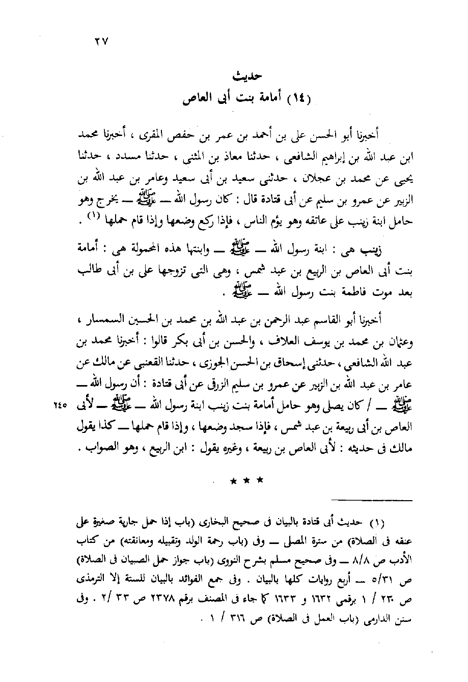 أَخْبَرَنَا أَبُو الْقَاسِمِ عَبْدُ الرَّحْمَنِ بْنُ عَبْدِ اللَّهِ بْنُ مُحَمَّدِ بْنِ الْحُسَيْنِ السِّمْسَارُ، وَعُثْمَانُ بْنُ مُحَمَّدِ بْنِ يُوسُفَ الْعَلافُ، وَالْحَسَنُ بْنُ أَبِي بَكْرٍ قَالُوا: أَخْبَرَنَا مُحَمَّدُ بْنُ عَبْدِ اللَّهِ الشَّافِعِيُّ، حَدَّثَنِي إِسْحَاقُ بْنُ الْحَسَنِ الْجَوْزِيُّ، حَدَّثَنَا الْقَعْنَبِيُّ عَنْ مَالِكٍ عَنْ عَامِرِ بْنِ عَبْدِ اللَّهِ بْنِ الزُّبَيْرِ عَنْ عَمْرِو بْنِ سُلَيْمٍ الزُّرَقِيِّ عَنْ أَبِي قَتَادَةَ: أَنَّ رَسُولُ اللَّهِ - صَلَّى اللَّهُ عَلَيْهِ وَسَلَّم َ - / كَانَ يُصَلِّي وَهُوَ حَامِلٌ أُمَامَةَ بِنْتَ زَيْنَبَ ابْنَةِ رَسُولِ اللَّهِ - صَلَّى اللَّهُ عَلَيْهِ وَسَلَّم َ - لأَبِي الْعَاصِ بْنِ أَبِي رَبِيعَةَ بْنِ عَبْدِ شَمْسٍ، فَإِذَا سَجَدَ وَضَعَهَا، وَإِذَا قَامَ حَمَلَهَا - كَذَا يَقُولُ مَالِكٌ فِي حَدِيثِهِ: لأَبِي الْعَاصِ بْنِ رَبِيعَةَ، وَغَيْرُهُ يَقُولُ: ابن الربيع، وهو الصواب.