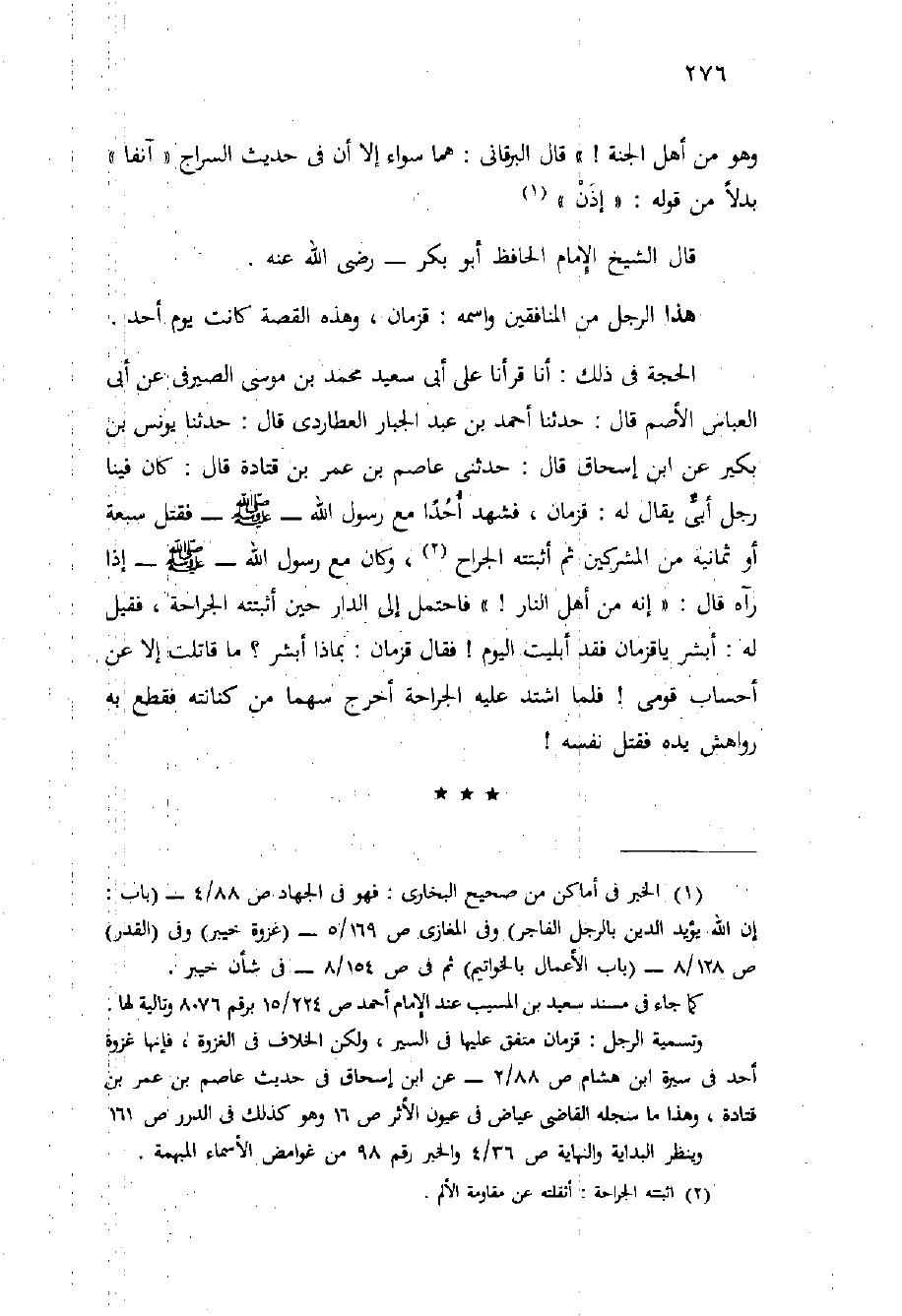 الحجة فِي ذلك: أَنَّا قَرَأْنَا عَلَى أَبِي سَعِيدٍ مُحَمَّدُ بْنُ مُوسَى الصَّيْرَفِيُّ عَنْ أَبِي الْعَبَّاسِ الأَصَمِّ قَالَ: حَدَّثَنَا أَحْمَدُ بْنُ عَبْدِ الْجَبَّارِ الْعُطَارِدِيُّ قَالَ: حَدَّثَنَا يُونُسُ بْنُ بُكَيْرٍ عَنِ ابْنِ إِسْحَاقَ قَالَ: حَدَّثَنِي عَاصِمُ بْنُ عُمَرَ بْنِ قَتَادَةَ قَالَ: كَانَ فِينَا رَجُلٌ أَبِيٌّ يُقَالُ لَهُ: قُزْمَانُ، فَشَهِدَ أُحُدًا مَعَ رَسُولِ اللَّهِ - صَلَّى اللَّهُ عَلَيْهِ وَسَلَّم َ - فَقَتَلَ سَبْعَةً أَوْ ثَمَانِيَةً مِنَ الْمُشْرِكِينَ ثُمَّ أَثْبَتَتْهُ الْجِرَاحَ، وَكَانَ مَعَ رَسُولِ اللَّهِ - صَلَّى اللَّهُ عَلَيْهِ وَسَلَّم َ - إِذَا رَآهُ قَالَ: " إِنَّهُ مِنْ أَهْلِ النَّارِ} " فَاحْتَمَلَ إِلَى الدَّارِ حِينَ أَثْبَتَتْهُ الْجِرَاحَةُ، فَقِيلَ لَهُ: أَبْشِرْ يَا قُزْمَانُ فَقَدْ أَبْلَيْتَ الْيَوْمَ {فَقَالَ قُزْمَانُ: بِمَاذَا أُبَشَّرُ؟ مَا قَاتَلْتُ إِلا عَنْ أَحْسَابِ قَوْمِي} فَلَمَّا اشْتَدَّ عَلَيْهِ الْجِرَاحَةُ أَخْرَجَ سَهْمًا مِنْ كِنَانَتِهِ فَقَطَعَ بِهِ رَوَاهِشَ يَدِهِ فَقَتَلَ نَفْسَهُ!