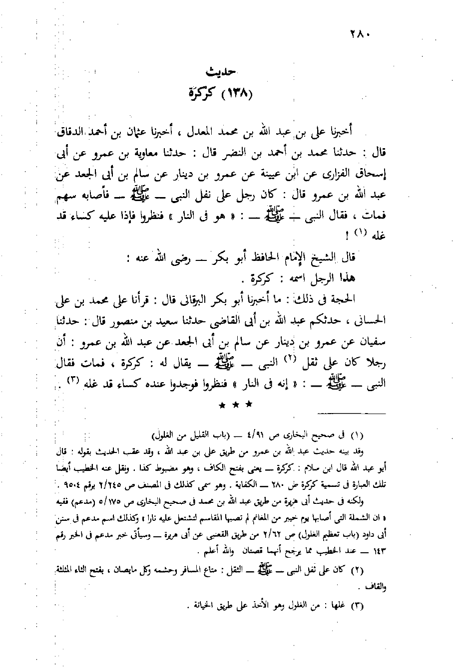 الحجة فِي ذلك: مَا أَخْبَرَنَا أَبُو بَكْرٍ الْبَرْقَانِيُّ قَالَ: قَرَأْنَا عَلَى مُحَمَّدِ بْنِ عَلِيٍّ الْحَسَّانِيِّ، حَدَّثَكُمْ عَبْدُ اللَّهِ بْنُ أَبِي الْقَاضِي حَدَّثَنَا سَعِيدُ بْنُ مَنْصُورٍ قَالَ: حَدَّثَنَا سُفْيَانُ عَنْ عَمْرِو بْنِ دِينَارٍ عَنْ سَالِمِ بْنِ أَبِي الْجَعْدِ عَنْ عَبْدِ اللَّهِ بْنِ عَمْرٍو: أَنَّ رَجُلا كَانَ عَلَى ثُقْلِ النَّبِيِّ - صَلَّى اللَّهُ عَلَيْهِ وَسَلَّم َ - يُقَالُ لَهُ: كَرْكَرَةُ، فَمَاتَ فَقَالَ النَّبِيِّ - صَلَّى اللَّهُ عَلَيْهِ وَسَلَّم َ -: " إِنَّهُ فِي النَّارِ " فَنَظَرُوا فَوَجَدُوا عنده كساء قد غله.