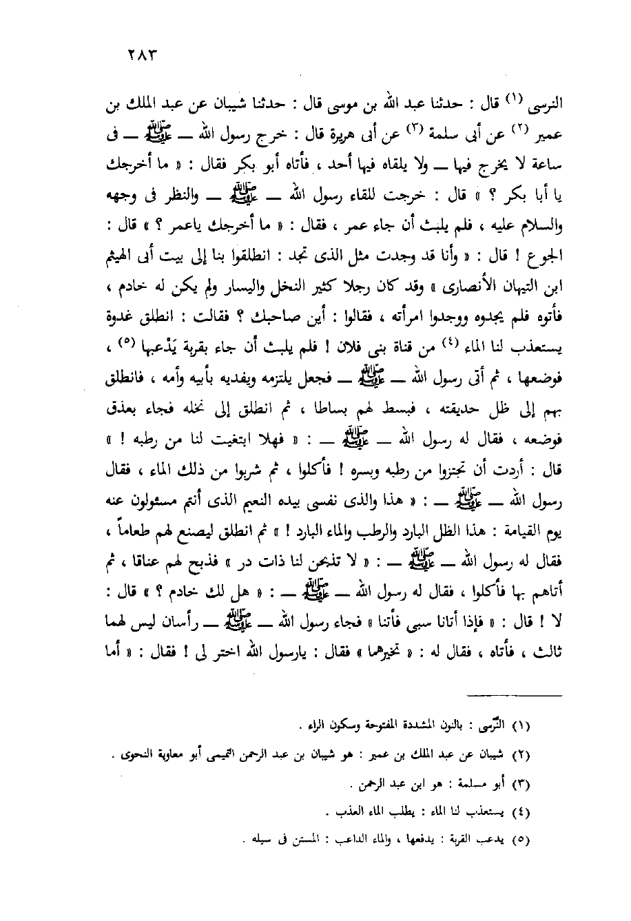 النَّرْسِيُّ قَالَ: حَدَّثَنَا عَبْدُ اللَّهِ بْنُ مُوسَى قَالَ: حَدَّثَنَا شَيْبَانُ عَنْ عَبْدِ الْمَلِكِ بْنِ عُمْيَرٍ عَنْ أَبِي سَلَمَةَ عَنْ أَبِي هُرَيْرَةَ قَالَ: خَرَجَ رَسُولُ اللَّهِ - صَلَّى اللَّهُ عَلَيْهِ وَسَلَّم َ - فِي سَاعَةٍ لا يَخْرُجُ فِيهَا - وَلا يَلْقَاهُ فِيهَا أَحَدٌ، فَأَتَاهُ أَبُو بَكْرٍ فَقَالَ: " مَا أَخْرَجَكَ يَا أَبَا بَكْرٍ؟ " قَالَ: خَرَجْتُ لِلِقَاءِ رَسُولِ اللَّهِ - صَلَّى اللَّهُ عَلَيْهِ وَسَلَّم َ - وَالنَّظَرِ فِي وَجْهِهِ وَالسَّلامِ عَلَيْهِ، فَلَمْ يَلْبَثْ أَنْ جَاءَ عُمَرُ، فَقَالَ: " مَا أَخْرَجَكَ يَا عُمَرُ؟ " قَالَ: الْجُوعُ {قَالَ: " وَأَنَا قَدْ وَجَدْتُ مِثْلَ الَّذِي تَجِدُ: انْطَلِقُوا بِنَا إِلَى بَيْتِ أَبِي الْهَيْثَمِ ابن التَّيْهَانِ الْأَنْصَارِيِّ " وَقَدْ كَانَ رَجُلا كَثِيرَ النَّخْلِ وَالْيَسَارِ وَلَمْ يَكُنْ لَهُ خَادِمٌ، فَأَتَوْهُ فَلَمْ يَجِدُوهُ وَوَجَدُوا امْرَأَتَهُ، فَقَالُوا: أَيْنَ صَاحِبُكِ؟ فَقَالَتْ: انْطَلَقَ غُدْوَةً يَسْتَعْذِبُ لَنَا الْمَاءَ مِنْ قَنَاةِ بَنِي فُلانٍ} فَلَمْ يَلْبَثْ أَنْ جَاءَ بِقِرْبَةٍ يَدْعَبُهَا، فَوَضَعَهَا، ثُمَّ أَتَى رَسُولَ اللَّهِ - صَلَّى اللَّهُ عَلَيْهِ وَسَلَّم َ - فَجَعَلَ يَلْتَزِمُهُ وَيُفْدِيهِ بِأَبِيهِ وَأُمِّهِ، فَانْطَلَقَ بِهِمْ إِلَى ظِلِّ حَدِيقَتِهِ، فَبَسَطَ لَهُمْ بُسَاطًا، ثُمَّ انْطَلَقَ إِلَى نَخْلِهِ فَجَاءَ بِعِذْقٍ فَوَضَعَهُ، فَقَالَ لَهُ رَسُولُ اللَّهِ - صَلَّى اللَّهُ عَلَيْهِ وَسَلَّم َ -: " فَهَلا ابْتَغَيْتَ لَنَا مِنْ رَطْبِهِ {" قَالَ: أَرَدْتُ أَنْ تَجْتَزُّوا مِنْ رَطْبِهِ وَبَسْرِهِ} فَأَكَلُوا، ثُمَّ شَرِبُوا مِنْ ذَلِكَ الْمَاءِ، فَقَالَ رَسُولُ اللَّهِ - صَلَّى اللَّهُ عَلَيْهِ وَسَلَّم َ -: " هَذَا وَالَّذِي نَفْسِي بِيَدِهِ النَّعِيمُ الَّذِي أَنْتُمْ مَسْئُولُونَ عَنْهُ يَوْمَ الْقِيَامَةِ: هَذَا الظِّلُّ الْبَارِدُ وَالرَّطْبُ وَالْمَاءُ الْبَارِدُ {" ثُمَّ انْطَلَقَ لِيَصْنَعَ لَهُمْ طَعَامًا، فَقَالَ لَهُ رَسُولُ اللَّهِ - صَلَّى اللَّهُ عَلَيْهِ وَسَلَّم َ -: " لا تَذْبَحَنَّ لَنَا ذَاتَ دَرٍّ " فَذَبَحَ لَهُمْ عِنَاقًا، ثُمَّ أَتَاهُمْ بِهَا فَأَكَلُوا، فَقَالَ لَهُ رَسُولُ اللَّهِ - صَلَّى اللَّهُ عَلَيْهِ وَسَلَّم َ -: " هَلْ لَكَ خَادِمٌ؟ " قَالَ: لا} قَالَ: " فَإِذَا أَتَانَا سَبْيٌ فَأْتِنَا " فَجَاءَ رَسُولُ اللَّهِ - صَلَّى اللَّهُ عَلَيْهِ وَسَلَّم َ - رَأْسَانِ لَيْسَ لَهُمَا ثَالِثٌ، فَأَتَاهُ، فَقَالَ لَهُ: " تَخَيَّرْهُمَا " فَقَالَ: يَا رَسُول اللَّهِ اخْتَرْ لِي! فَقَالَ: " أما