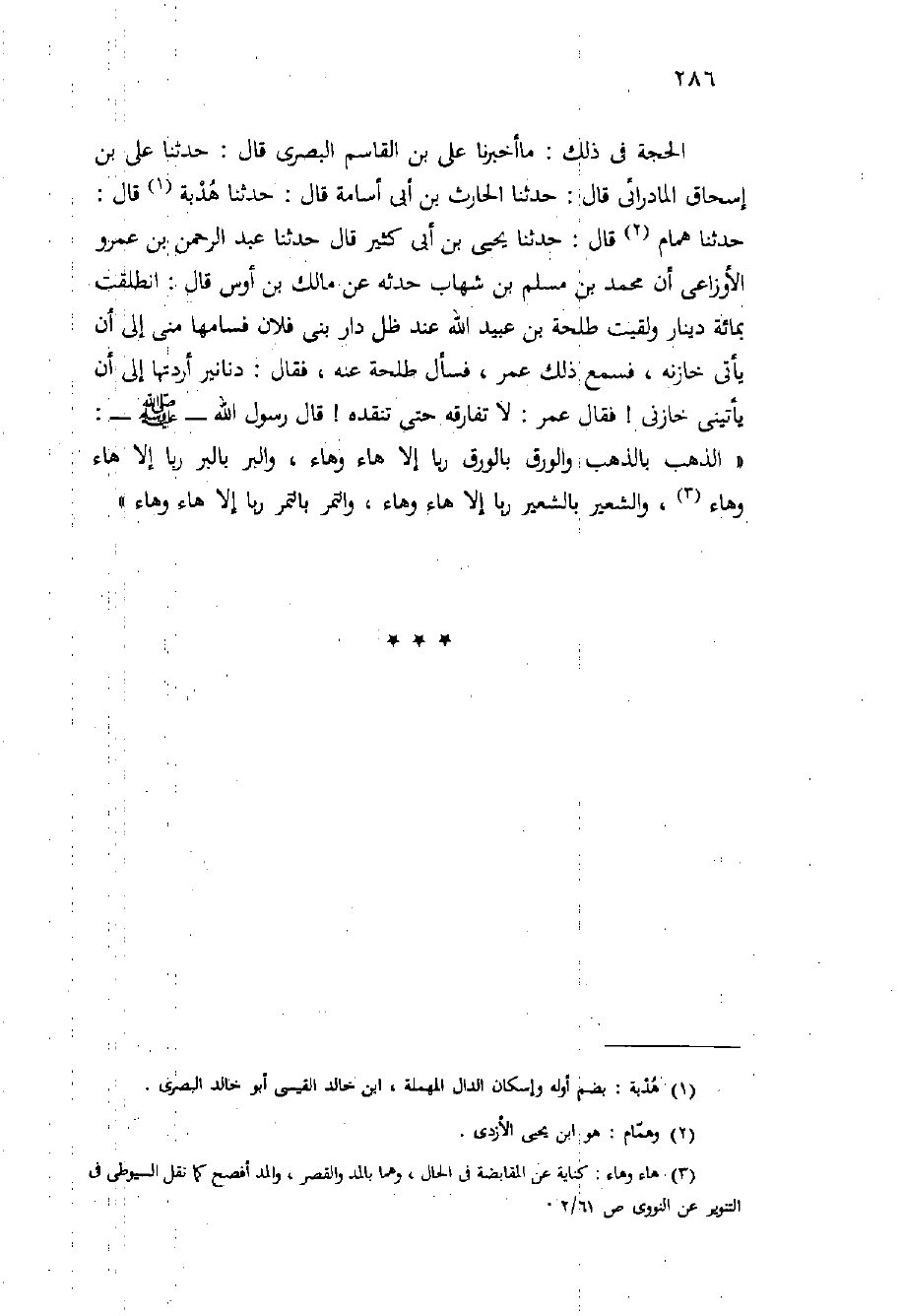الحجة في ذلك: مَا أَخْبَرَنَا عَلِيُّ بْنُ الْقَاسِمِ الْبَصْرِيُّ قَالَ: حَدَّثَنَا عَلِيُّ بْنُ إِسْحَاقَ الْمَادَرَائِيُّ قَالَ: حَدَّثَنَا الْحَارِثُ بْنُ أَبِي أُسَامَةَ قَالَ: حَدَّثَنَا هُدْبَةُ قَالَ: حَدَّثَنَا هَمَّامٌ قَالَ: حَدَّثَنَا يَحْيَى بْنُ أَبِي كَثِيرٍ قَالَ حَدَّثَنَا عَبْدُ الرَّحْمَنِ بْنُ عَمْرٍو الأَوْزَاعِيُّ أَنَّ مُحَمَّدَ بْنَ مُسْلِمِ بْنِ شِهَابٍ حَدَّثَهُ عَنْ مَالِكِ بْنِ أَوْسٍ قَالَ: انْطَلَقْتُ بِمِائَةِ دِينَارٍ وَلَقِيتُ طَلْحَةَ بْنَ عُبَيْدِ اللَّهِ عِنْدَ ظِلِّ دَارِ بَنِي فُلانٍ فَسَامَهَا مِنِّي إِلَى أَنْ يَأْتِيَ خَازِنُهُ، فَسَمِعَ ذَلِكَ عُمَرُ، فَسَأَلَ طَلْحَةَ عَنْهُ، فَقَالَ: دَنَانِيرُ أَرَدْتُهَا إِلَى أَنْ يَأْتِيَنِي خَازِنِي {فَقَالَ عُمَر: لا تُفَارِقْهُ حَتَّى تَنْقُدَهُ} قَالَ رَسُولُ اللَّهِ - صَلَّى اللَّهُ عَلَيْهِ وَسَلَّم َ -: " الذَّهَبُ بِالذَّهَبِ وَالْوَرِقُ بِالْوَرِقِ رِبًا إِلا هَاءً وَهَاءً، وَالْبُرُّ بِالْبُرِّ رِبًا إِلا هَاءً وَهَاءً، وَالشَّعِيرُ بِالشَّعِيرِ رِبًا إِلا هَاءً وَهَاءً، وَالتَّمْرُ بِالتَّمْرِ رِبًا إِلا هَاءً وهاء