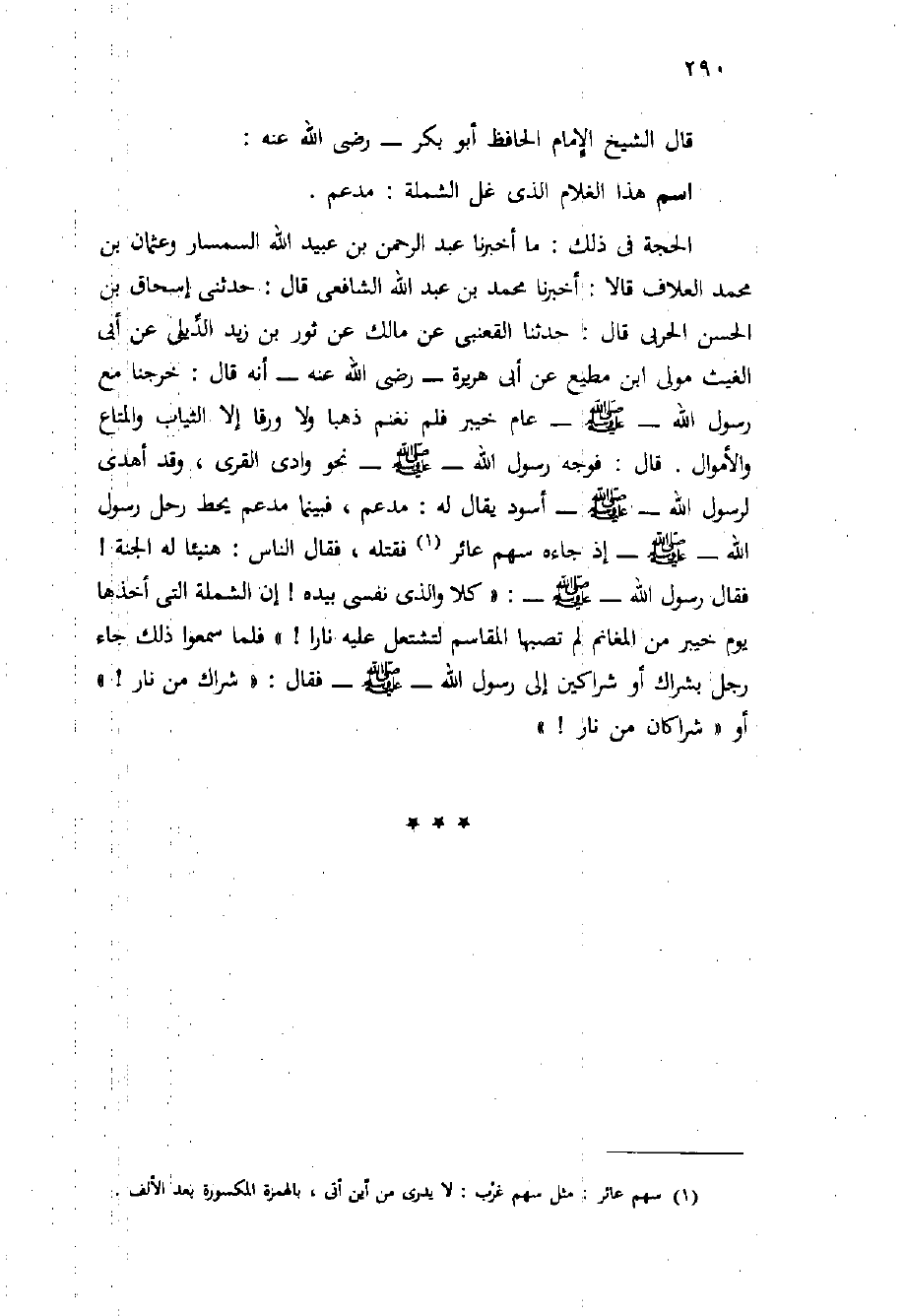 الحجة فِي ذلك: مَا أَخْبَرَنَا عَبْدُ الرَّحْمَنِ بْنُ عُبَيْدِ اللَّهِ السِّمْسَارُ وَعُثْمَانُ بْنُ مُحَمَّدٍ الْعَلافُ قَالا: أَخْبَرَنَا مُحَمَّدُ بْنُ عَبْدِ اللَّهِ الشَّافِعِيُّ قَالَ: حَدَّثَنِي إِسْحَاقُ بْنُ الْحَسَنِ الْحَرْبِيُّ قَالَ: حَدَّثَنَا الْقَعْنَبِيُّ عَنْ مَالِكٍ عَنْ ثَوْرِ بْنِ زَيْدٍ الدَّيْلِيِّ عَنْ أَبِي الْغَيْثِ مَوْلَى ابْنِ مُطِيعٍ عَنْ أَبِي هُرَيْرَةَ - رَضِيَ اللَّهُ عَنْهُ - أَنَّهُ قَالَ: خَرَجْنَا مَعَ رَسُولُ اللَّهِ - صَلَّى اللَّهُ عَلَيْهِ وَسَلَّم َ - عَامَ خَيْبَرَ فَلَمْ نَغْنَمْ ذَهَبًا وَلا وَرِقًا إِلا الثِّيَابَ وَالْمَتَاعَ وَالأَمْوَالَ. قَالَ: فَوَجَّهَ رَسُولُ اللَّهِ - صَلَّى اللَّهُ عَلَيْهِ وَسَلَّم َ - نَحْوَ وَادِي الْقُرَى، وَقَدْ أُهْدِيَ لِرَسُولِ اللَّهِ - صَلَّى اللَّهُ عَلَيْهِ وَسَلَّم َ - أَسْوَدُ يُقَالُ لَهُ: مُدَعَّمٌ، فَبَيْنَمَا مُدَعَّمٌ يَحَطُّ رَحْلَ رَسُولِ اللَّهِ - صَلَّى اللَّهُ عَلَيْهِ وَسَلَّم َ - إِذْ جَاءَهُ سَهْمٌ عَائِرٌ فَقَتَلَهُ، فَقَالَ النَّاسُ: هَنِيئًا لَهُ الْجَنَّةَ {فَقَالَ رَسُولُ اللَّهِ - صَلَّى اللَّهُ عَلَيْهِ وَسَلَّم َ -: " كَلا وَالَّذِي نَفْسِي بِيَدِهِ} إِنَّ الشَّمْلَةَ الَّتِي أَخَذَهَا يَوْمَ خَيْبَرَ مِنَ الْمَغَانِمِ لَمْ تُصِبْهَا الْمَقَاسِمُ لِتَشْتَعِلَ عَلَيْهِ نَارًا {" فَلَمَّا سَمِعُوا ذَلِكَ جَاءَ رَجُلٌ بِشِرَاكٍ أَوْ شِرَاكَيْنِ إِلَى رَسُولِ اللَّهِ - صَلَّى اللَّهُ عَلَيْهِ وَسَلَّم َ - فَقَالَ: " شِرَاكٌ مِنْ نَارٍ} " أَوْ " شراكان من نار! ".