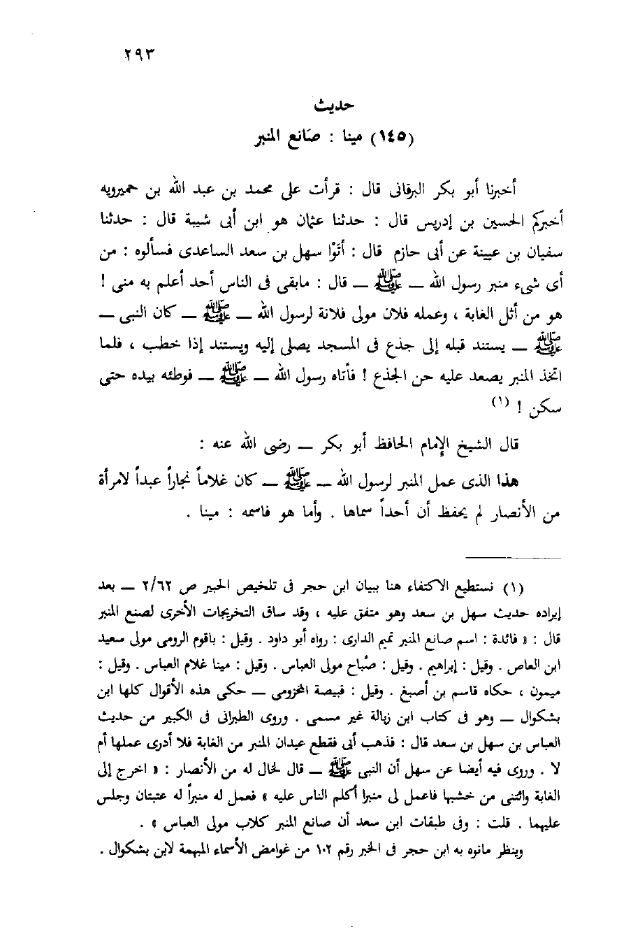 أَخْبَرَنَا أَبُو بَكْرٍ الْبَرْقَانِيُّ قَالَ: قَرَأْتُ عَلَى مُحَمَّدِ بْنِ عَبْدِ اللَّهِ بْنِ حَمِيرَوَيْهِ أَخْبَرَكُمُ الْحُسَيْنُ بْنُ إِدْرِيسَ قَالَ: حَدَّثَنَا عُثْمَانُ هُوَ ابْنُ أَبِي شَيْبَةَ قَالَ: حَدَّثَنَا سُفْيَانُ بْنُ عُيَيْنَةَ عَنْ أَبِي حَازِمٍ قَالَ: أَتَوْا سَهْلَ بْنَ سَعْدٍ السَّاعِدِيَّ فَسَأَلُوهُ: مِنْ أَيِّ شَيْءٍ مِنْبَرُ رَسُولُ اللَّهِ - صَلَّى اللَّهُ عَلَيْهِ وَسَلَّم َ - قَالَ: مَا بَقِيَ فِي النَّاسِ أَحَدٌ أَعْلَمُ بِهِ مِنِّي {هُوَ مِنْ أَثَلِ الْغَابَةِ، وَعَمِلَهُ فُلانٌ مَوْلَى فُلانَةَ لِرَسُولِ اللَّهِ - صَلَّى اللَّهُ عَلَيْهِ وَسَلَّم َ - كَانَ النَّبِيُّ - صَلَّى اللَّهُ عَلَيْهِ وَسَلَّم َ - يستند قَبْلَهُ إِلَى جَذْعٍ فِي الْمَسْجِدِ يُصَلِّي إِلَيْهِ وَيَسْتَنِدُ إِذَا خَطَبَ، فَلَمَّا اتَّخَذَ الْمِنْبَرَ يَصْعَدُ عَلَيْهِ حَنَّ الْجِذْعُ} فَأَتَاهُ رَسُولُ اللَّهِ - صَلَّى اللَّهُ عَلَيْهِ وَسَلَّم َ - فَوَطِئَهُ بِيَدِهِ حَتَّى سَكَنَ!