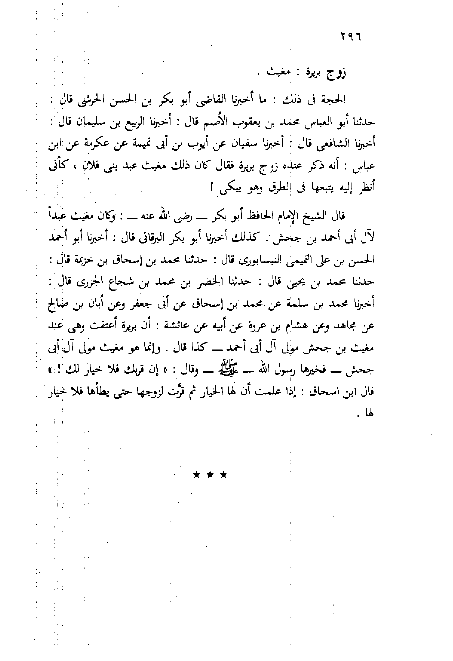 الحجة فِي ذلك: مَا أَخْبَرَنَا الْقَاضِي أَبُو بَكْرِ بْنُ الْحَسَنِ الْحَرَشِيُّ قَالَ: حَدَّثَنَا أَبُو الْعَبَّاسِ مُحَمَّدُ بْنُ يَعْقُوبَ الأَصَمُّ قَالَ: أَخْبَرَنَا الرَّبِيعُ بْنُ سُلَيْمَانَ قَالَ: أَخْبَرَنَا الشَّافِعِيُّ قَالَ: أَخْبَرَنَا سُفْيَانُ عَنْ أَيُّوبَ بْنِ أَبِي تَمِيمَةَ عَنْ عِكْرِمَةَ عَنِ ابْنِ عَبَّاسٍ: أَنُّه ذُكِرَ عِنْدَه زَوْجِ بُرَيْرَةَ فَقَالَ كَانَ ذَلِكَ مُغِيثٌ عَبْدُ بَنِي فُلانٍ، كَأَنِّي أَنْظُرُ إِلَيْهِ يَتْبَعُهَا فِي الطُّرُقِ وَهُوَ يَبْكِي {