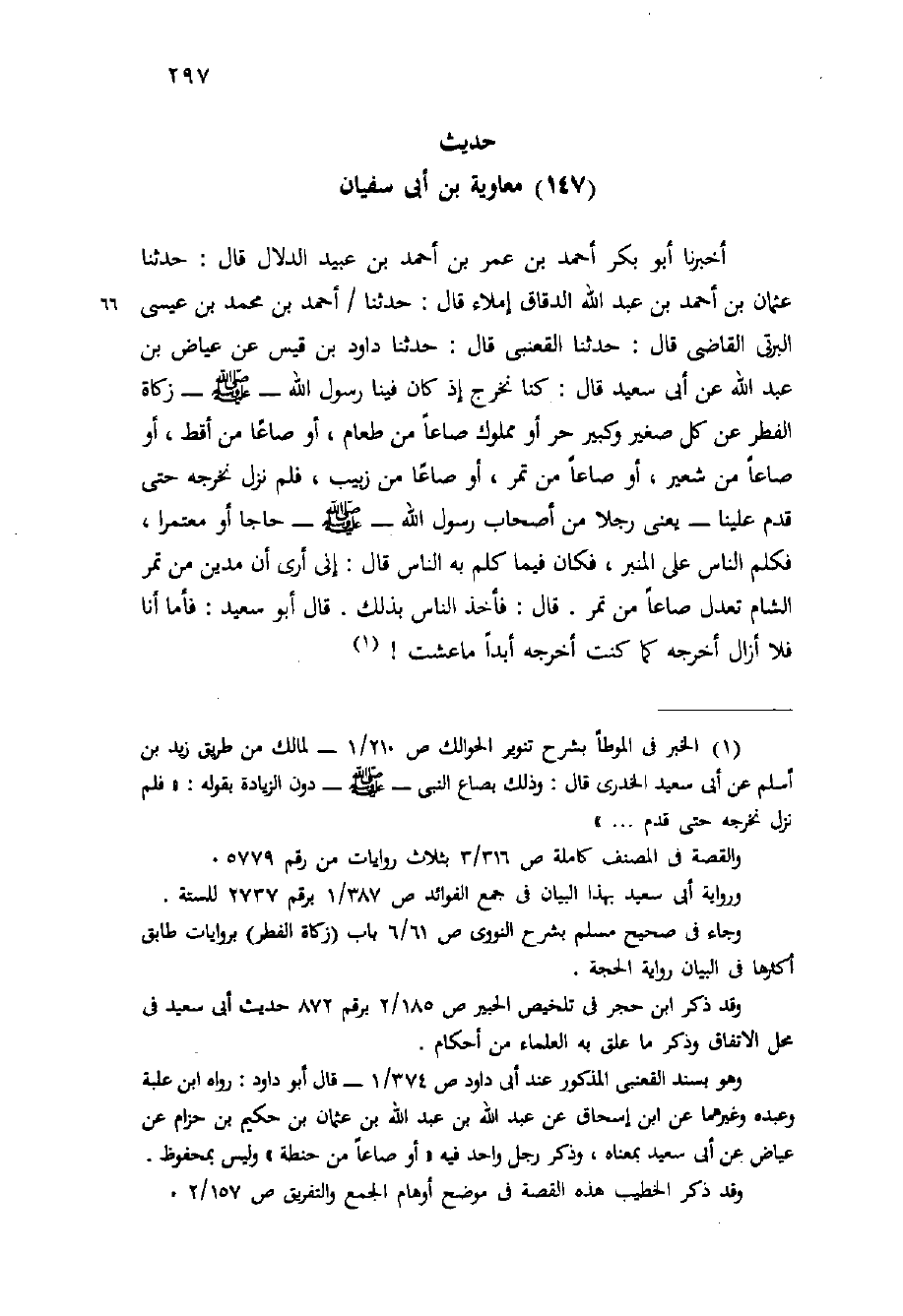 أَخْبَرَنَا أَبُو بَكْرٍ أَحْمَدُ بْنُ عُمَرَ بْنِ أَحْمَدَ بْنِ عُبَيْدٍ الدَّلالُ قَالَ: حَدَّثَنَا عُثْمَانُ بْنُ أَحْمَدَ بْنِ عَبْدِ اللَّهِ الدَّقَّاقُ إِمْلاءً قَالَ: حَدَّثَنَا / أَحْمَدُ بْنُ مُحَمَّدِ بْنِ عِيسَى الْبِرْتِيُّ الْقَاضِي قَالَ: حَدَّثَنَا الْقَعْنَبِيُّ قَالَ: حَدَّثَنَا دَاوُدُ بْنُ قَيْسٍ عَنْ عِيَاضِ بْنِ عَبْدِ اللَّهِ عَنْ أَبِي سَعِيدٍ قَالَ: كنا نخرج إذ كَانَ فِينَا رَسُولُ اللَّهِ - صَلَّى اللَّهُ عَلَيْهِ وَسَلَّم َ - زَكَاةَ الْفِطْرِ عَنْ كُلِّ صَغِيرٍ وَكَبِيرٍ حُرٍّ أَوْ مَمْلُوكٍ صَاعًا مِنْ طَعَامٍ أَوْ صَاعًا مِنْ أَقَطٍ، أَوْ صَاعًا مِنْ شَعِيرٍ، أَوْ صَاعًا مِنْ تَمْرٍ، أَوْ صَاعًا مِنْ زَبِيبٍ، فَلَمْ نَزَلْ نُخْرِجُهُ حَتَّى قَدِمَ عَلَيْنَا - يَعْنِي رجلا مِنْ أَصْحَابِ رَسُولِ اللَّهِ - صَلَّى اللَّهُ عَلَيْهِ وَسَلَّم َ - حَاجًّا أَوْ مُعْتَمِرًا، فَكَلَّمَ النَّاسَ عَلَى الْمِنْبَرِ، فَكَانَ فِيمَا كَلَّم بِهِ النَّاسَ قَالَ: إِنِّي أَرَى أَنَّ مُدَّيْنِ مِنْ تَمْرِ الشَّامِ تَعْدِلُ صَاعًا مِنْ تَمْرٍ. قَالَ: فَأَخَذَ النَّاسُ بِذَلِكَ. قَالَ أَبُو سَعِيدٍ: فَأَمَّا أَنَا فَلا أَزَالُ أُخْرِجُهُ كَمَا كُنْتُ أُخْرِجُهُ أَبَدًا ما عشت!