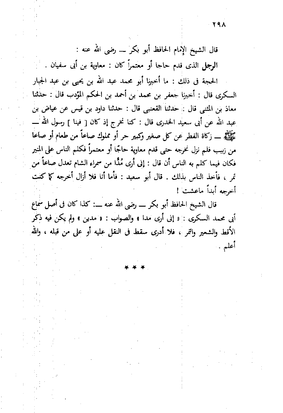 قَالَ الشَّيْخ الْحَافِظُ أَبُو بَكْرٍ - رَضِيَ اللَّهُ عَنْهُ -: كَذَا كَانَ فِي أَصْلِ سَمَاعِ أَبِي مُحَمَّدٍ السُّكَّرِيِّ: " إِنِّي أَرَى مَدًّا " وَالصَّوَابُ: " مَدَّيْنِ " وَلَمْ يَكُنْ فِِيِهِ ذِكْرُ الأَقْطِ وَالشَّعِيرِ وَالتَّمْرِ، فَلا أَدْرِي سَقَطَ فِي النَّقْلِ عَلَيْهِ أَوْ عَلَى مَنْ قبله، والله أعلم.