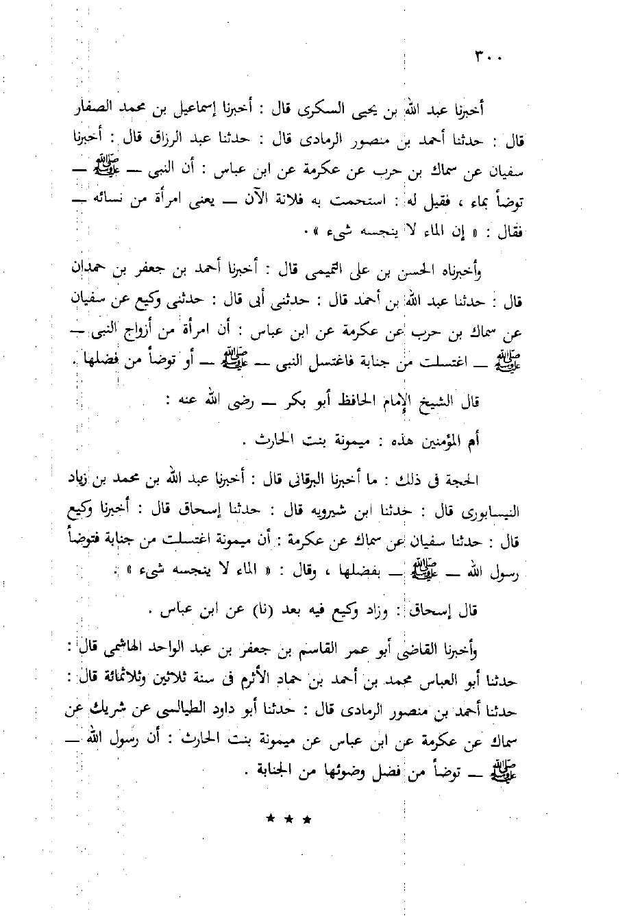 أَخْبَرَنَا عَبْدُ اللَّهِ بْنُ يَحْيَى السُّكَّرِيُّ قَالَ: أَخْبَرَنَا إِسْمَاعِيلُ بْنُ مُحَمَّدٍ الصَّفَّارُ قَالَ: حَدَّثَنَا أَحْمَدُ بْنُ مَنْصُورٍ الرَّمَادِيُّ قَالَ: حَدَّثَنَا عَبْدُ الرَّزَّاقِ قَالَ: أَخْبَرَنَا سُفْيَانُ عَنْ سِمَاكِ بْنِ حَرْبٍ عَنْ عِكْرِمَةَ عَنِ ابْنِ عَبَّاسٍ: أَنَّ النَّبِيِّ - صَلَّى اللَّهُ عَلَيْهِ وَسَلَّم َ - تَوَضَّأَ بِمَاءٍ، فَقِيلَ لَهُ: اسْتَحَمَّتْ بِهِ فُلانَةٌ الآنَ - يَعْنِي امْرَأَةً مِنْ نِسَائِهِ - فَقَالَ: " إِنَّ الْمَاءَ لا يُنْجِسُهُ شَيْءٌ ".