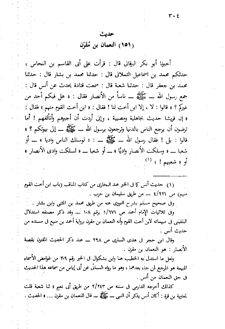 أَخْبَرَنَا أَبُو بَكْرٍ الْبَرْقَانِيُّ قَالَ: قَرَأْتُ عَلَى أَبِي الْقَاسِمِ بْنِ النَّحَّاسِ، حَدَّثَكُمْ مُحَمَّدُ بْنُ إِسْمَاعِيلَ الثملانِيُّ قَالَ: حَدَّثَنَا مُحَمَّدُ بْنُ بَشَّارٍ قَالَ: حَدَّثَنَا مُحَمَّدِ بْنُ جَعْفَرٍ قَالَ: حَدَّثَنَا شُعْبَةُ قَالَ: سَمِعْتُ قَتَادَةَ يُحَدِّثُ عَنْ أَنَسٍ قَالَ: جَمَعَ رَسُولُ اللَّهِ - صَلَّى اللَّهُ عَلَيْهِ وَسَلَّم َ - نَاسًا مِنَ الأَنْصَارِ فَقَالَ: " هَلْ فِيكُمْ أَحَدٌ مِنْ غَيْرِكُمْ؟ " قَالُوا: لا، إِلا ابْنَ أُخْتٍ لَنَا {فَقَالَ: " ابْنُ أُخْتِ الْقَوْمِ مِنْهُمْ " فَقَالَ: " إِنَّ قُرَيْشًا حَدِيثٌ بِجَاهِلِيَّةٍ وَمُصِيبَةٍ، وَإِنِّي أَرَدْتُ أَنْ أَجْبُرَهُمْ وَأَتَأَلَّفَهُمْ} أَمَا تَرْضَوْنَ أَنْ يَرْجِعَ النَّاسُ بِالدُّنْيَا وَتَرْجِعُونَ بِرَسُولِ اللَّهِ - صَلَّى اللَّهُ عَلَيْهِ وَسَلَّم َ - إِلَى بُيُوتِكُمْ؟ " قَالُوا: بَلَى {فَقَالَ رَسُولُ اللَّهِ - صَلَّى اللَّهُ عَلَيْهِ وَسَلَّم َ -: " لَوْ سَلَكَ النَّاسُ وَادِيًا " - أَوْ شِعْبًا - " وَسَلَكَتِ الأَنْصَارُ وَادِيًا " - أَوْ شِعْبًا - " لَسَلَكْتُ وَادِيَ الأَنْصَارِ " أَوْ " شعبهم} "