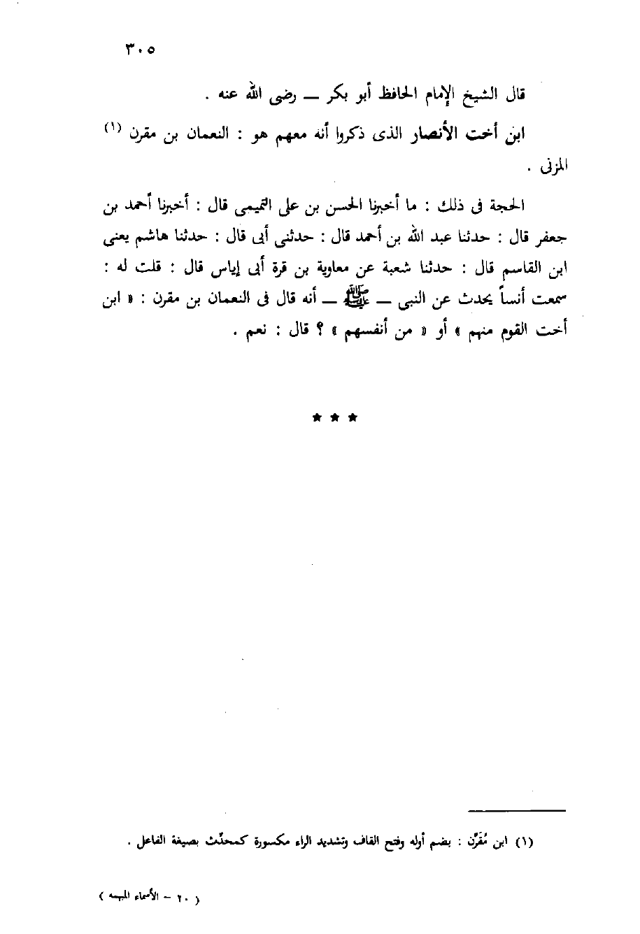 الحجة فِي ذلك: مَا أَخْبَرَنَا الْحَسَنُ بْنُ عَلِيٍّ التَّمِيمِيُّ قَالَ: أَخْبَرَنَا أَحْمَدُ بْنُ جَعْفَرِ قَالَ: حَدَّثَنَا عَبْدُ اللَّهِ بْنُ أَحْمَدَ قَالَ: حَدَّثَنِي أَبِي قَالَ: حَدَّثَنَا هَاشِمٌ يَعْنِي ابْنَ الْقَاسِمِ قَالَ: حَدَّثَنَا شُعْبَةُ عَنْ مُعَاوِيَةَ بْنِ قُرَّةَ أَبِي إِيَاسٍ قَالَ: قُلْتُ لَهُ: سَمِعْتُ أَنَسًا يُحَدِّثُ عَنِ النَّبِيِّ - صَلَّى اللَّهُ عَلَيْهِ وَسَلَّم َ - أَنَّهُ قَالَ فِي النُّعْمَانِ بْنِ مُقَرِّنٍ: " ابْنُ أُخْتِ الْقَوْمِ مِنْهُمْ " أَوْ " مِنْ أَنْفُسِهِمْ "؟ قَالَ: نَعَمْ.