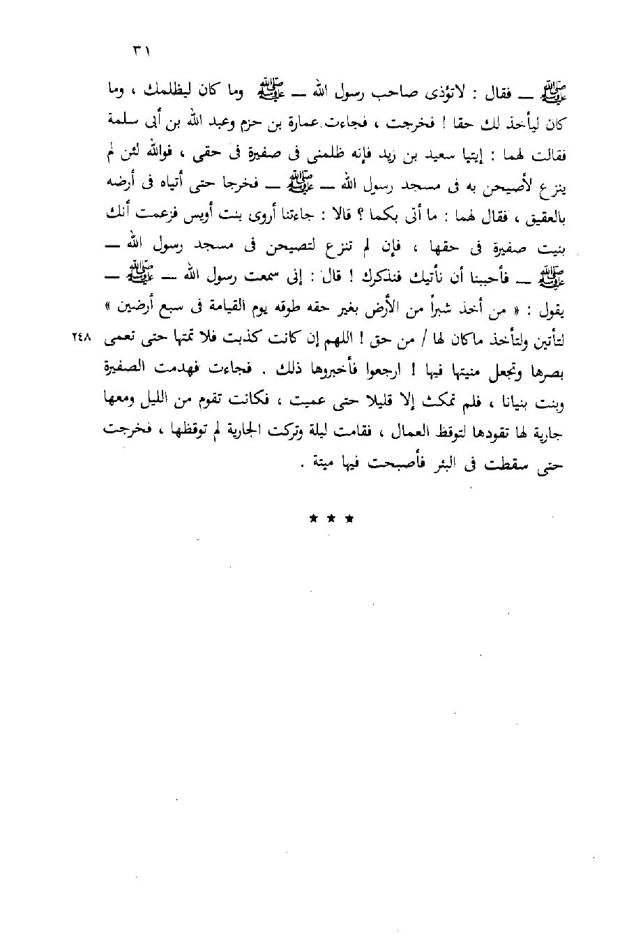 - صَلَّى اللَّهُ عَلَيْهِ وَسَلَّم َ - فَقَالَ: لا تُؤْذِي صَاحِبَ رَسُولِ اللَّهِ - صَلَّى اللَّهُ عَلَيْهِ وَسَلَّم َ - وَمَا كَانَ لِيَظْلِمَكِ، وَمَا كَانَ لِيَأْخُذَ لَكِ حَقًّا {فَخَرَجَتْ، فَجَاءَتْ عِمَارَةَ بْنَ حَزْمٍ وَعَبْدَ اللَّهِ بْنَ أَبِي سَلَمَةَ فَقَالَتْ لَهُمَا: إيتيا سَعِيدَ بْنَ زَيْدٍ فَإِنَّهُ ظَلَمَنِي فِي صَفِيرَةٍ فِي حَقِّي، فَوَاللَّهِ لَئِنْ لَمْ يَنْزَعْ لأَصِيحَنَّ بِهِ فِي مَسْجِدِ رَسُولِ اللَّهِ - صَلَّى اللَّهُ عَلَيْهِ وَسَلَّم َ - فَخَرَجَا حَتَّى أَتَيَاهُ فِي أَرْضِهِ بِالْعَقِيقِ، فَقَالَ لَهُمَا: مَا أَتَى بِكُمَا؟ قَالا: جَاءَتْنَا أَرْوَى بِنْتُ أُوَيْسٍ فَزَعَمَتْ أَنَّكَ بَنَيْتَ صَفِيرَةً فِي حَقِّهَا، فَإِنْ لَمْ تَنْزَعْ لَتَصِيحَنَّ فِي مَسْجِدِ رَسُولِ اللَّهِ - صَلَّى اللَّهُ عَلَيْهِ وَسَلَّم َ - فَأَحْبَبْنَا أَنْ نَأْتِيَكَ فَنُذَكِّرُكَ} قَالَ: إِنِّي سَمِعْتُ رَسُولَ اللَّهِ - صَلَّى اللَّهُ عَلَيْهِ وَسَلَّم َ - يَقُولُ: " مَنْ أَخَذَ شِبْرًا مِنَ الأَرْضِ بِغَيْرِ حَقِّهِ طَوَّقَهُ يَوْمَ الْقِيَامَةِ فِي سَبْعِ أَرَضِينَ " لِتَأْتِيَنَّ وَلْتَأْخُذْ مَا كَانَ لَهَا / مِنْ حَقٍّ {اللَّهُمَّ إِنْ كَانَتْ كَذَبَتْ فَلا تُمِتْهَا حَتَّى تُعْمِيَ بَصَرَهَا وَتَجْعَلَ مَنِيَّتَهَا فِيهَا} ارْجِعُوا فَأَخْبِرُوهَا ذَلِكَ. فَجَاءَتْ فَهَدَمَتِ الصَّفِيرَةَ وَبَنَتْ بُنْيَانًا، فَلَمْ تَمْكُثْ إِلا قَلِيلا حَتَّى عَمِيَتْ، فَكَانَتْ تَقُومُ مِنَ اللَّيْلِ وَمَعَهَا جَارِيَةٌ لَهَا تَقُودُهَا لِتُوقِظَ الْعُمَّالَ، فَقَامَتْ لَيْلَةً وَتَرَكَتِ الْجَارِيَةَ لَمْ تُوقِظْهَا، فَخَرَجْت حَتَّى سَقَطَتْ فِي الْبِئْرِ فَأَصْبَحَتْ فِيهَا ميتة.