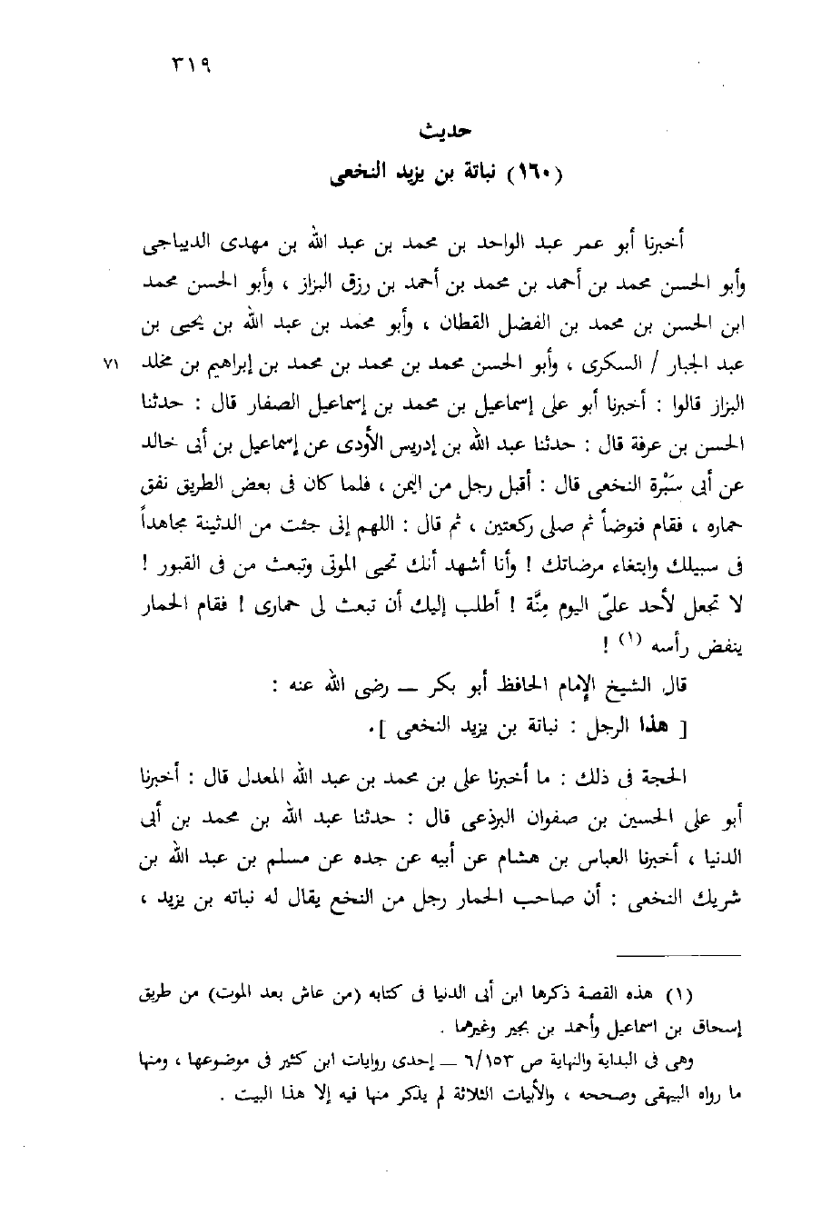 أخبرنا أَبُو عُمَرَ عَبْدُ الْوَاحِدِ بْنُ مُحَمَّدِ بْنِ عَبْدِ اللَّهِ بْنِ مَهْدِيٍّ الديباجي وأَبُو الْحَسَنِ مُحَمَّد بْن أَحْمَدَ بْنِ مُحَمَّدِ بْنِ أَحْمَدَ بْن رزق الْبَزَّاز، وأَبُو الْحَسَنِ محمد ابن الْحَسَنِ بْن مُحَمَّدِ بْنِ الْفَضْلِ الْقَطَّان، وأبو مُحَمَّد بْن عَبْدِ اللَّهِ بْنُ يَحْيَى بْنِ عَبْدِ الجبار / السكري، وأَبُو الْحَسَنِ مُحَمَّد بْنِ مُحَمَّدِ بْنِ مُحَمَّدِ بْنِ إِبْرَاهِيمَ بْن مخلد الْبَزَّاز قَالُوا: أَخْبَرَنَا أَبُو عَلِيٍّ إِسْمَاعِيلُ بْنُ مُحَمَّدِ بْنِ إِسْمَاعِيلَ الصفار قَالَ: حَدَّثَنَا الْحَسَن بْن عرفة قَالَ: حَدَّثَنَا عَبْدُ اللَّهِ بْنُ إدريس الأودي عن إِسْمَاعِيل بْن أَبِي خَالِد عن أَبِي سبرة النخعي قَالَ: أقبل رَجُل من اليمن، فلما كان في بعض الطريق نفق حمارة، فقام فتوضأ ثُمَّ صلى ركعتين، ثُمَّ قَالَ: اللهم إني جئت من الدثينة مجاهدًا فِي سبيلك وابتغاء مرضاتك {وأنا أشهد أنك تحيي الموتى وتبعث من في القبور} لا تجعل لأحد عليّ اليوم منة {أطلب إليك أن تبعث لي حماري} فقام الحمار ينفض رأسه!