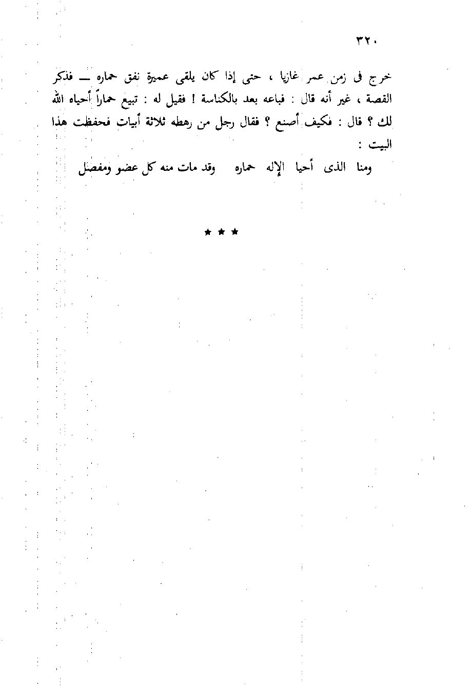 خرج فِي زمن عُمَر غازيًا، حَتَّى إِذَا كَانَ يلقى عميرة نفق حماره - فذكر القصة، غير أَنَّهُ قَالَ: فباعه بعد بالكناسة! فقيل لَهُ: تبيع حمارًا أحياه اللَّه لَكَ؟ قَالَ: فكيف أصنع؟ فَقَالَ رَجُل من رهطه ثلاثة أبيات فحفظت هَذَا البيت: