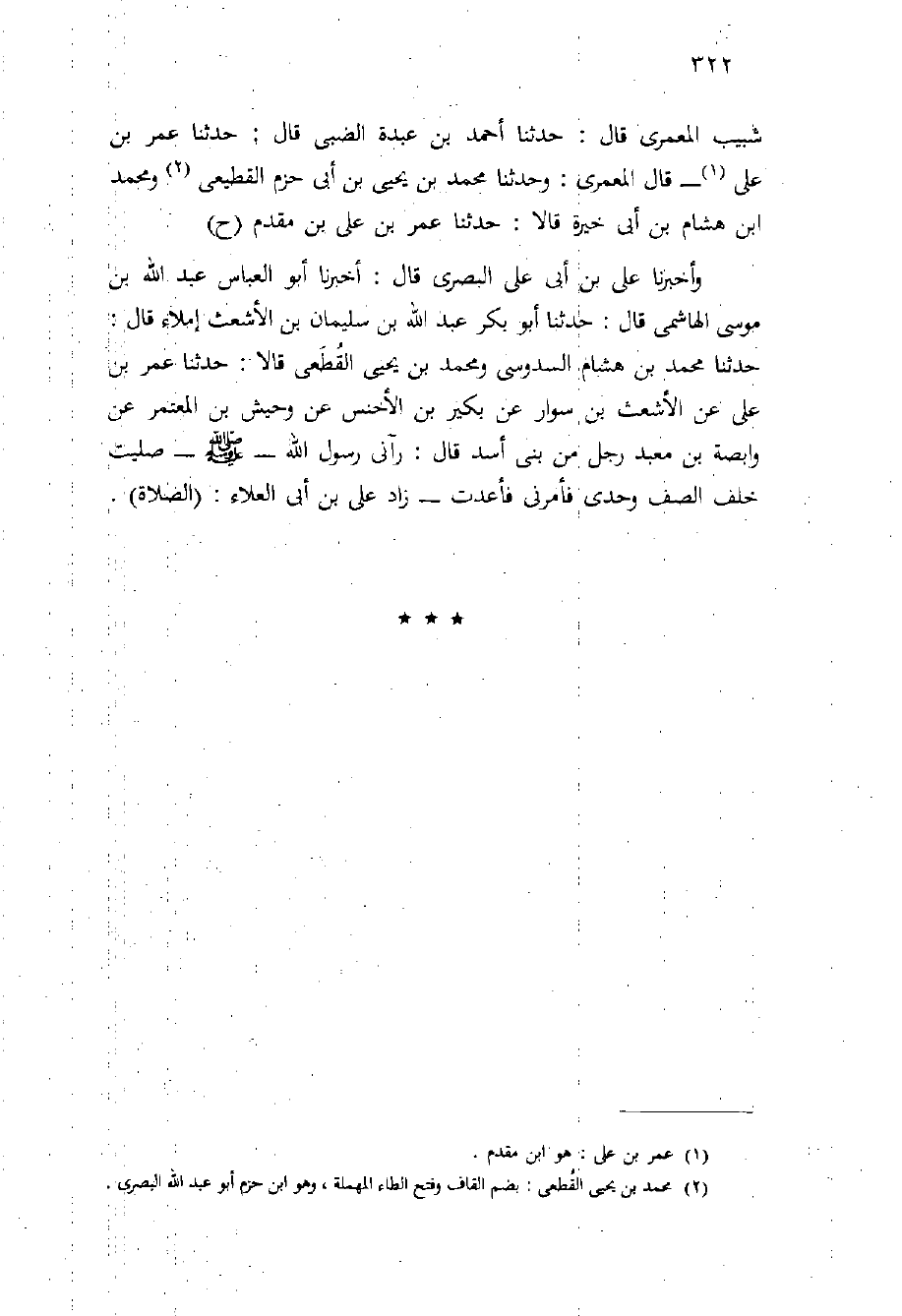 شَبِيبٍ الْمَعْمَرِيُّ قَالَ: حَدَّثَنَا أَحْمَدُ بْنُ عَبْدَةَ الضَّبِّيُّ قَالَ: حَدَّثَنَا عُمَرُ بْنُ عَلِيٍّ - قَالَ الْمَعْمَرِيُّ: وَحَدَّثَنَا مُحَمَّدُ بْنُ يَحْيَى بْنِ أبي حزم القطيعي ومحمد ابن هِشَامِ بْنِ أَبِي خَيْرَةَ قَالا: حَدَّثَنَا عُمَرُ بْنُ عَلِيِّ بْنِ مقدام (ح)