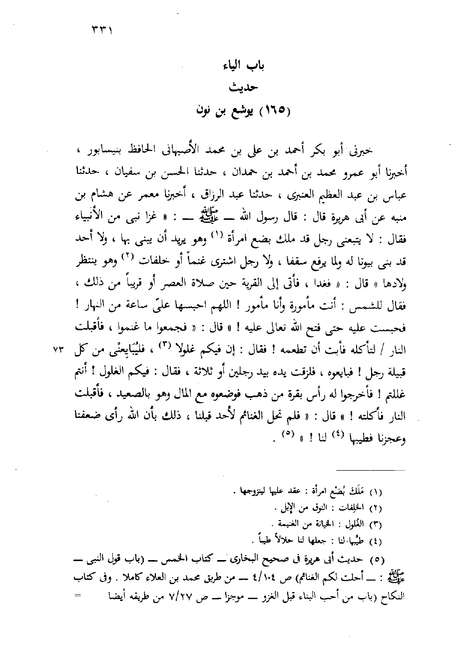 خبرني أَبُو بَكْرٍ أَحْمَدُ بْنُ عَلِيِّ بْنِ مُحَمَّدٍ الأَصْبَهَانِيُّ الْحَافِظُ بِنَيْسَابُورَ، أَخْبَرَنَا أَبُو عَمْرٍو مُحَمَّدُ بْنُ أَحْمَدَ بْنِ حَمْدَانَ، حَدَّثَنَا الْحَسَنُ بْنُ سُفْيَانَ، حَدَّثَنَا عَبَّاسُ بْنُ عَبْدِ الْعَظِيمِ الْعَنْبَرِيُّ، حَدَّثَنَا عَبْدُ الرَّزَّاقِ، أَخْبَرَنَا مَعْمَرٌ عَنْ هِشَامِ بْنِ مُنَبِّهٍ عَنْ أَبِي هُرَيْرَةَ قَالَ: قَالَ رَسُولُ اللَّهِ - صَلَّى اللَّهُ عَلَيْهِ وَسَلَّم َ -: " غَزَا نَبِيٌّ مِنَ الأَنْبِيَاءِ فَقَالَ: لا يَتَّبِعُنِي رَجُلٌ قَدْ مَلَكَ بُضْعَ امْرَأَةٍ وَهُوَ يُرِيدُ أَنْ يَبْنِيَ بِهَا، وَلا أَحَدٌ قَدْ بَنَى بُيُوتًا لَهُ وَلَمْا يَرْفَعْ سَقْفًا، وَلا رَجُلٌ اشْتَرَى غَنَمًا أَوْ خَلِفَاتٍ وَهُوَ يَنْتَظِرُ وِلادَهَا " قال: " فغدا، فأتى إلى الْقَرْيَةَ حِينَ صَلاةِ الْعَصْرِ أَوْ قَرِيبًا مِنْ ذَلِكَ، فَقَالَ لِلشَّمْسِ: أَنْتِ مَأْمُورَةٌ وَأَنَا مَأْمُورٌ {اللَّهُمَّ احْبِسْهَا عَلَيَّ سَاعَةً مِنَّ النَّهَارِ} فَحُبِسَتْ عَلَيْهِ حَتَّى فَتَحَ اللَّهُ تَعَالى عَلَيْهِ {" قَالَ: " فَجَمَعُوا مَا غَنِمُوا، فَأَقْبَلَتِ النَّارُ / لِتَأْكُلَهُ فَأَبَتْ أَنْ تَطْعَمَهُ} فَقَالَ: إِنَّ فِيكُمْ غَلُولًا، فَلْيُبَايِعْنِي مِنْ كُلِّ قَبِيلَةٍ رَجُلٌ {فَبَايَعَوهُ، فَلَزِقَتْ يَدُهُ بِيَدِ رَجُلَيْنٍ أَوْ ثَلاثَةً، فَقَالَ: فِيكُمُ الْغَلُولُ} أَنْتُمْ غَلَلْتُمْ {فَأَخْرَجُوا لَهُ رَأْسَ بَقَرَةٍ مِنْ ذَهَبٍ فَوَضَعُوهُ مع الْمَالِ وَهُوَ بِالصَّعِيدِ، فَأَقْبَلَتِ النَّارُ فَأَكَلَتْهُ} " قَالَ: " فَلَمْ تَحِلُّ الْغَنَائِمُ لأَحَدٍ قَبْلَنَا، ذَلِكَ بِأَنَّ اللَّهَ رَأَى ضَعْفَنَا وَعَجْزَنَا فَطَيَّبَهَا لَنَا! ".