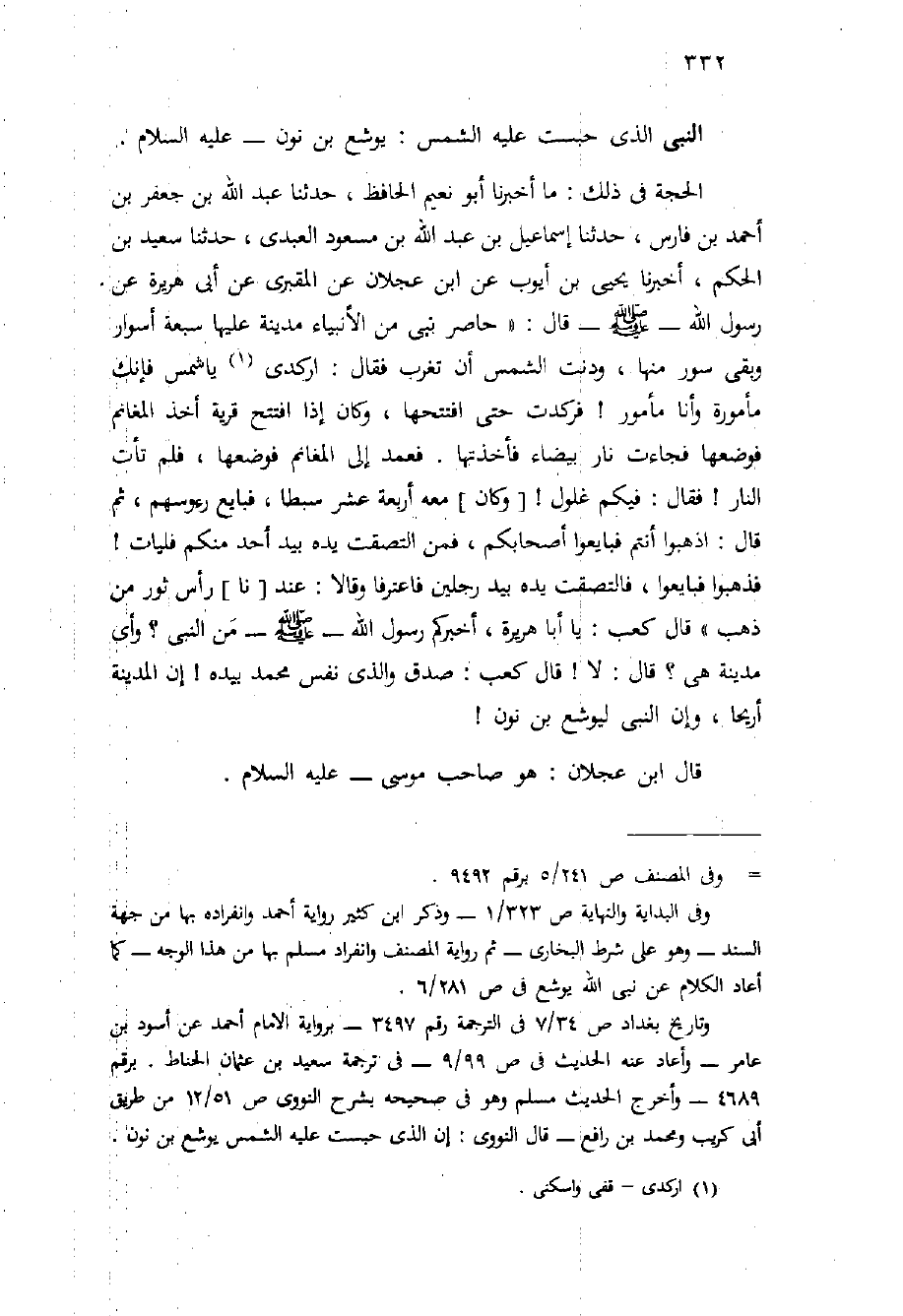 الحجة في ذلك: مَا أَخْبَرَنَا أَبُو نُعَيْمٍ الْحَافِظُ، حَدَّثَنَا عَبْدُ اللَّهِ بْنُ جَعْفَرِ بْنِ أَحْمَدَ بْنِ فَارِسٍ، حَدَّثَنَا إِسْمَاعِيلُ بْنُ عَبْدِ اللَّهِ بْنِ مَسْعُودٍ الْعَبْدِيُّ، حَدَّثَنَا سَعِيدُ بْنُ الْحَكَمِ، أَخْبَرَنَا يَحْيَى بْنُ أَيُّوبَ عَنِ ابْنِ عَجْلانَ عَنِ الْمَقْبُرِيِّ عَنْ أَبِي هُرَيْرَةَ عَنْ رَسُولِ اللَّهِ - صَلَّى اللَّهُ عَلَيْهِ وَسَلَّم َ - قَالَ: " حَاصَرَ نَبِيٌّ مِنَ الأَنْبِيَاءِ مَدِينَةً عَلَيْهَا سَبْعَةُ أَسْوَارٍ وَبَقِيَ سُورٌ مِنْهَا، وَدَنَتِ الشَّمْسُ أَنْ تَغْرُبَ فَقَالَ: ارْكُدِي يَا شَمْسُ فَإِنَّكِ مَأْمُورَةٌ وَأَنَا مَأْمُورٌ {فَرَكَدَتْ حَتَّى افْتَتَحَهَا، وَكَانَ إِذَا افْتَتَحَ قَرْيَةً أَخَذَ الْمَغَانِمَ فَوَضَعَهَا فَجَاءَتْ نَارٌ بَيْضَاءُ فَأَخَذَتْهَا. فَعَمَدَ إِلَى الْمَغَانِمِ فَوَضَعَهَا، فَلَمْ تَأْتِ النَّارَ} فَقَالَ: فِيكُمْ غَلُولٌ { [وَكَانَ] مَعَهُ أَرْبَعَةَ عَشَرَ سِبْطًا، فَبَايَعَ رُءُوسَهُمْ، ثُمَّ قَالَ: اذْهَبُوا أَنْتُمْ فَبَايِعُوا أَصْحَابَكُمْ، فَمَنِ الْتَصَقَتْ يَدُهُ بِيَدِ أَحَدٍ مِنْكُمْ فَلْيَأْتِ} فَذَهَبُوا فَبَايَعُواُ، فَالْتَصَقَتْ يَدُهُ بِيَدِ رَجُلَيْنِ فَاعْتَرَفَا وقالا: عند [نا] رَأْسُ ثَوْرٍ مِنْ ذَهَبٍ " قَالَ كَعْبٌ: يَا أَبَا هُرَيْرَةَ، أَخْبَرَكُمْ رَسُولُ اللَّهِ - صَلَّى اللَّهُ عَلَيْهِ وَسَلَّم َ - مَنِ النَّبِيُّ؟ وَأَيُّ مَدِينَةٍ هِيَ؟ قَالَ: لا {قَالَ كَعْبٌ: صَدَقَ وَالَّذِي نَفْسُ مُحَمَّدٍ بِيَدِهِ} إِنَّ الْمَدِينَةَ أَرِيحَا، وَإِنَّ النَّبِيَّ لَيُوشَعُ بْنُ نُونَ!