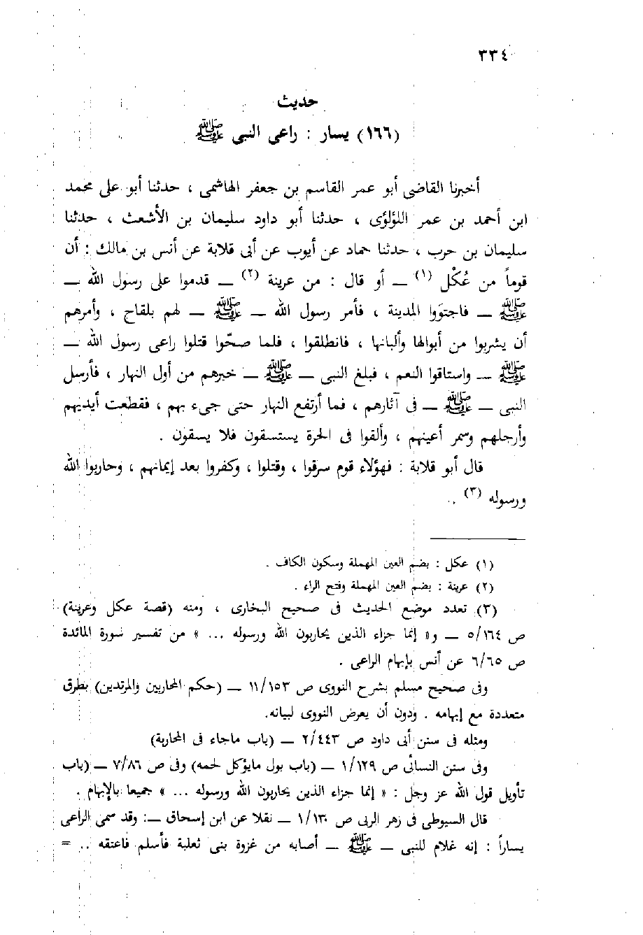 أَخْبَرَنَا الْقَاضِي أَبُو عُمَرَ الْقَاسِمُ بْنُ جَعْفَرٍ الْهَاشِمِيُّ، حَدَّثَنَا أَبُو علي محمد ابن أحمد بن عمر اللُّؤْلُؤِيُّ، حَدَّثَنَا أَبُو دَاوُدَ سُلَيْمَانُ بْنُ الأَشْعَثَ، حَدَّثَنَا سُلَيْمَانُ بْنُ حَرْبٍ، حَدَّثَنَا حَمَّادٌ عَنْ أَيُّوبَ عَنْ أَبِي قِلابَةَ عَنْ أَنَسِ بْنِ مَالِكٍ: أَنَّ قَوْمًا مِنْ عُكْلٍ - أَوْ قَالَ: مِنْ عُرَيْنَةَ - قَدِمُوا عَلَى رَسُولِ اللَّهِ - صَلَّى اللَّهُ عَلَيْهِ وَسَلَّم َ - فَاجْتَوُوا الْمَدِينَةَ، فَأَمَرَ رَسُولُ اللَّهِ - صَلَّى اللَّهُ عَلَيْهِ وَسَلَّم َ - لَهُمْ بِلِقَاحٍ، وَأَمَرَهُمْ أَنْ يَشْرَبُوا مِنْ أَبْوَالِهَا وَأَلْبَانِهَا، فَانْطَلَقُوا، فَلَمَّا صَحُّوا قَتَلُوا رَاعِيَ رَسُولِ اللَّهِ - صَلَّى اللَّهُ عَلَيْهِ وَسَلَّم َ - وَاسْتَاقُوا النَّعَمَ، فَبَلَغَ النَّبِيَّ - صَلَّى اللَّهُ عَلَيْهِ وَسَلَّم َ - خَبَرُهُمْ مِنْ أَوَّلِ النَّهَارِ، فَأَرْسَلَ النَّبِيِّ - صَلَّى اللَّهُ عَلَيْهِ وَسَلَّم َ - فِي آثَارِهِمْ، فَمَا ارْتَفَعَ النَّهَارُ حَتَّى جِيءَ بِهِمْ، فَقُطِعَتْ أَيْدِيهِمْ وَأَرْجُلُهُمْ وَسَمَرَ أَعْيُنَهُمْ، وَأُلْقُوا فِي الْحَرَّةِ يَسْتَسْقُونَ فَلا يُسْقَوْنَ.