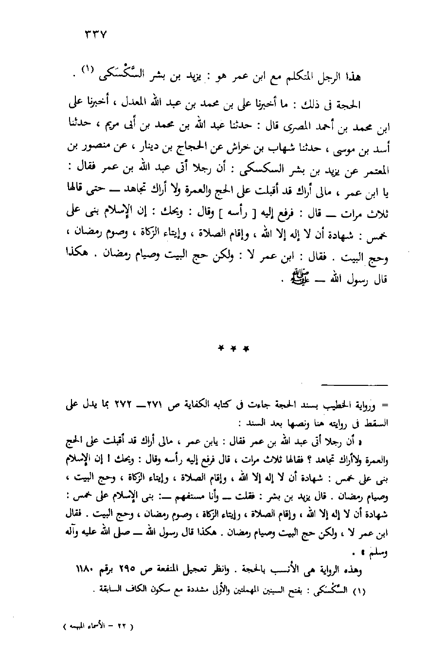 الحجة فِي ذَلِكَ: مَا أَخْبَرَنَا عَلِيُّ بْنُ مُحَمَّدِ بْنِ عَبْدِ اللَّهِ الْمُعَدَّلُ، أَخْبَرَنَا عَلِيُّ ابن مُحَمَّدِ بْنِ أَحْمَدَ الْمَصْرِيُّ قَالَ: حَدَّثَنَا عَبْدُ اللَّهِ بْنُ مُحَمَّدٍ بْنِ أَبِي مَرْيَمَ، حَدَّثَنَا أَسَدُ بْنُ مُوسَى، حَدَّثَنَا شِهَابُ بْنُ خِرَاشٍ عَنِ الْحَجَّاجِ بْنِ دِينَارٍ، عَنْ مَنْصُورِ بْنِ الْمُعْتَمِرِ عَنْ يَزِيدَ بْنِ بِشْرٍ السَّكْسَكِيِّ: أَنَّ رَجُلا أَتَى عَبْدَ اللَّهِ بْنَ عُمَرَ فَقَالَ: يَا ابْنَ عُمَر، مالي أَرَاكَ قَدْ أَقْبَلْتَ عَلَى الْحَجِّ وَالْعُمْرَةِ وَلا أَرَاكَ تُجَاهِدُ - حَتَّى قَالَهَا ثَلاثَ مَرَّاتٍ - قَالَ: فَرَفَعَ إِلَيْهِ [رَأْسَهُ] وَقَالَ: وَيْحَكَ: إِنَّ الإِسْلامَ بُنِيَ عَلَى خَمْسٍ: شَهَادَةُ أَنْ لا إِلَهَ إِلا اللَّهُ، وَإِقَامُ الصَّلاةِ، وَإِيتَاءُ الزَّكَاةِ، وَصَوْمُ رمضان، وحج البيت. فقال: ابْنُ عُمَرَ لا: وَلَكِنَّ حَجَّ الْبَيْتِ وَصِيَامُ رَمَضَانَ. هَكَذَا قَالَ رَسُولُ اللَّهِ - صَلَّى اللَّهُ عَلَيْهِ وَسَلَّم َ -.
