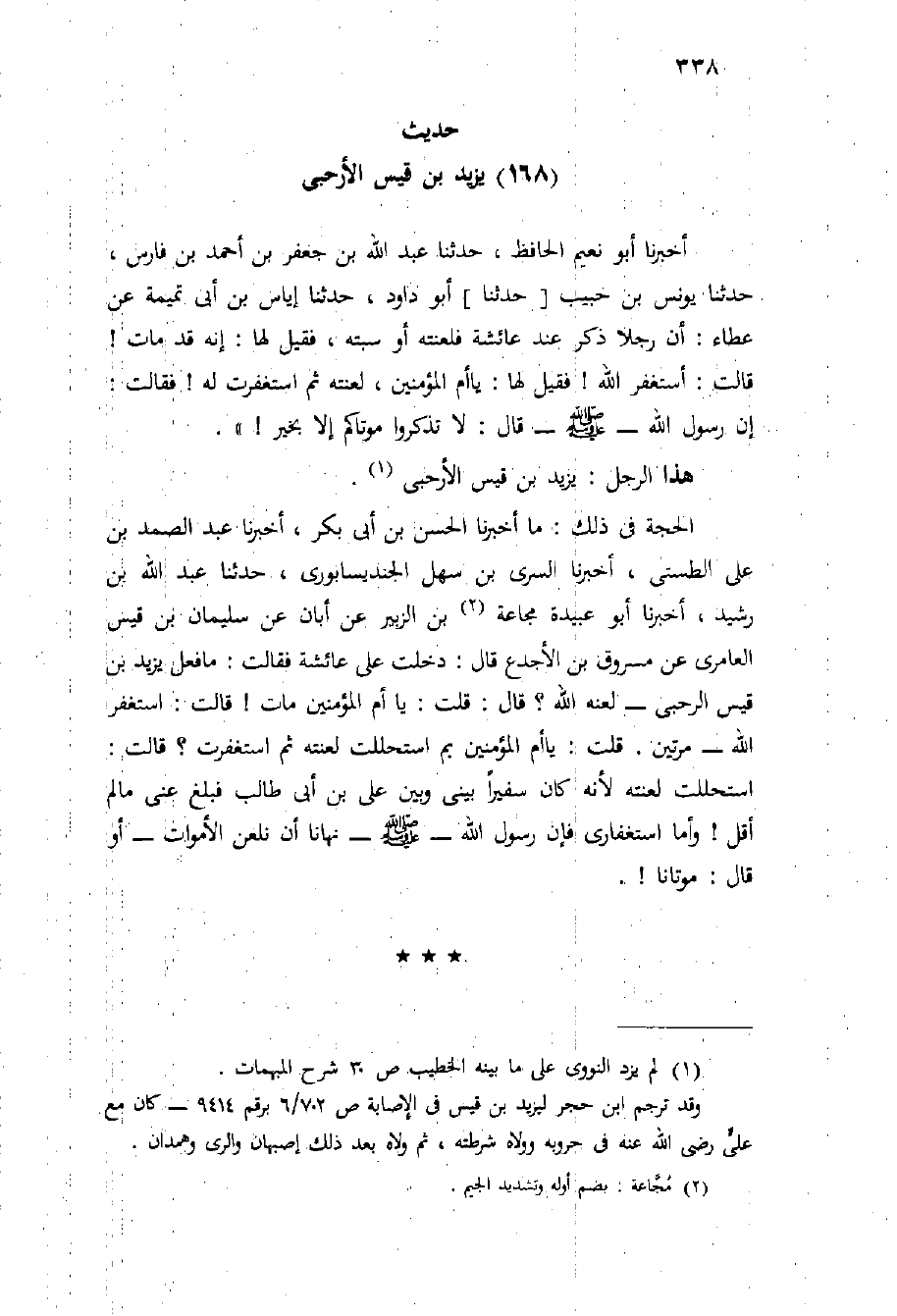 الحجة فِي ذَلِكَ: مَا أَخْبَرَنَا الْحَسَنُ بْنُ أَبِي بَكْرٍ، أَخْبَرَنَا عَبْدُ الصَّمَدِ بْنُ عَلِيٍّ الطَّسْتِيُّ، أَخْبَرَنَا السَّرِيُّ بْنُ سهل الجنديسابوري، حَدَّثَنَا عَبْدُ اللَّهِ بْنُ رَشِيدٍ، أَخْبَرَنَا أَبُو عُبَيْدَةَ مَجَاعَةُ بْنُ الزُبَيْرِ عَنْ أَبَانٍ عَنْ سُلَيْمَانَ بْنِ قَيْسٍ الْعَامِرِيُّ عَنْ مَسْرُوقِ بْنِ الأَجْدَعِ قَالَ: دَخَلَتْ عَلَى عَائِشَةَ فَقَالَتْ: مَا فَعَلَ يَزِيدُ بْنُ قَيْسٍ الرَّحْبِيُّ - لَعَنَهُ اللَّهُ؟ قَالَ: قُلْتُ: يَا أُمَّ الْمُؤْمِنِينَ مَاتَ {قَالَتْ: أَسْتَغْفِرُ اللَّهَ - مَرَّتَيْنِ. قُلْتُ: يَا أُمَّ الْمُؤْمِنِينَ بِمَ اسْتَحْلَلْتِ لَعْنَتَهُ ثُمَّ اسْتَغْفَرْتِ؟ قَالَتِ: اسْتَحْلَلْتُ لَعْنَتَهُ لأَنَّهُ كَانَ سَفِيرًا بَيْنِي وَبَيْنَ عَلِيِّ بْنِ أَبِي طالب فبلغ عني مالم أَقُلْ} وَأَمَّا اسْتِغْفَارِي فَإِنَّ رَسُولَ اللَّهِ - صَلَّى اللَّهُ عَلَيْهِ وَسَلَّم َ - نَهَانَا أَنْ نَلْعَنَ الأَمْوَاتَ - أَوْ قال: موتانا! .