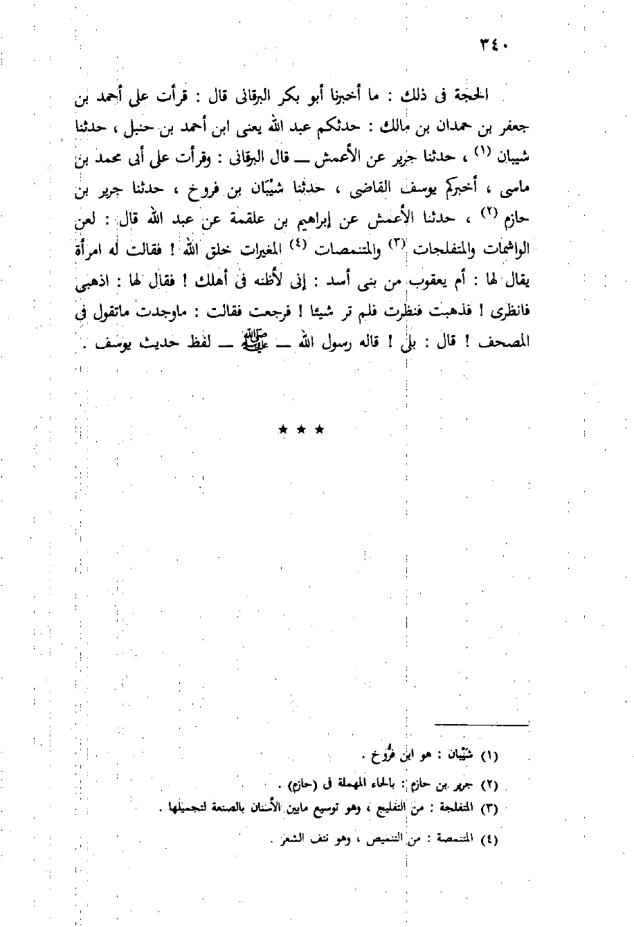 الحجة في ذلك: مَا أَخْبَرَنَا أَبُو بَكْرٍ الْبَرْقَانِيُّ قَالَ: قَرَأْتُ عَلَى أَحْمَدَ بْنِ جَعْفَرِ بْنِ حَمْدَانَ بْنِ مَالِكٍ: حَدَّثَكُمْ عَبْدُ اللَّهِ يَعْنِي ابْنَ أَحْمَدَ بْنِ حَنْبَلٍ، حَدَّثَنَا شَيْبَانُ، حَدَّثَنَا جَرِيرٌ عَنِ الْأَعْمَشِ - قَالَ الْبَرْقَانِيُّ: وَقَرَأْتُ عَلَى أَبِي مُحَمَّدِ بْنِ مَاسِيٍّ، أَخْبَرَكُمْ يُوسُفُ الْقَاضِي، حَدَّثَنَا شَيْبَانُ بْنُ فَرُّوخَ، حَدَّثَنَا جَرِيرُ بْنُ حَازِمٍ، حَدَّثَنَا الْأَعْمَشُ عَنْ إِبْرَاهِيمَ بن عَلْقَمَةَ عَنْ عَبْدِ اللَّهِ قَالَ: لُعِنَ الْوَاشِمَاتُ وَالْمُتَفَلِّجَاتُ وَالْمُتَنَمِّصَاتُ الْمُغَيِّرَاتُ لخلق اللَّهِ {فَقَالَتْ لَهُ امْرَأَةٌ يُقَالُ لَهَا: أُمُّ يَعْقُوبَ مِنْ بَنِي أَسَدٍ: إِنِّي لأَظُنُّهُ فِي أَهْلِكَ} فَقَالَ لَهَا: اذْهَبِي فَانْظُرِي {فَذَهَبَتْ فَنَظَرَتْ فَلَمْ تَرَ شَيْئًا} فَرَجَعَتْ فَقَالَتْ: مَا وَجَدْتُ مَا تَقُولُ فِي الْمُصْحَفِ {قَالَ: بَلَى} قَالَهُ رَسُولُ اللَّهِ - صَلَّى اللَّهُ عَلَيْهِ وَسَلَّم َ - لفظ حديث يوسف.