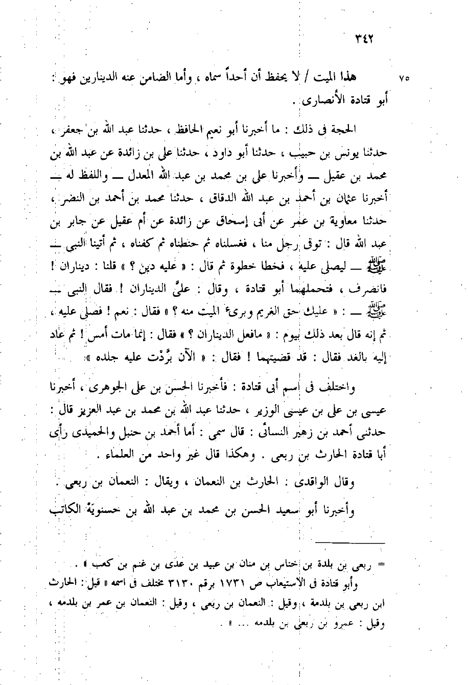 هَذَا الْمَيِّتُ / لا يُحْفَظُ أَنَّ أَحَدًا سَمَّاهُ، وَأَمَّا الضَّامِنُ عَنْهُ الدِّينَارَيْنِ فَهُوَ: أَبُو قَتَادَةَ الْأَنْصَارِيُّ.
