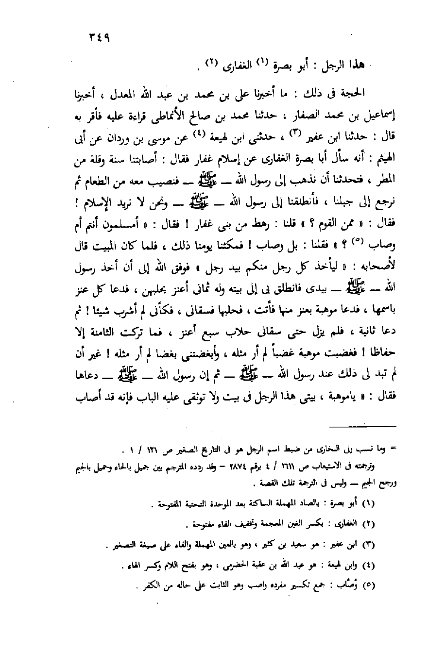 الحجة في ذلك: مَا أَخْبَرَنَا عَلِيُّ بْنُ مُحَمَّدِ بْنِ عَبْدِ اللَّهِ الْمُعَدَّلُ، أَخْبَرَنَا إِسْمَاعِيلُ بْنُ مُحَمَّدٍ الصَّفَّارُ، حَدَّثَنَا مُحَمَّدُ بْنُ صَالِحٍ الأَنْمَاطِيُّ قِرَاءَةً عَلَيْهِ فَأَقَرَّ بِهِ قَالَ: حَدَّثَنَا ابْنُ عُفَيْرٍ، حَدَّثَنِي ابْنُ لَهِيعَةَ عَنْ مُوسَى بْنِ وَرْدَانَ عَنْ أَبِي الْهَيْثَمِ: أَنَّهُ سَأَلَ أَبَا بَصْرَةَ الْغِفَارِيُّ عَنْ إِسْلامِ غِفَارٍ فَقَالَ: أَصَابَتْنَا سَنَةٌ وَقِلَّةٌ مِنَ الْمَطَرِ، فَتَحَدَّثْنَا أَنْ نَذْهَبَ إِلَى رَسُولِ اللَّهِ - صَلَّى اللَّهُ عَلَيْهِ وَسَلَّم َ - فَنُصِيبُ مَعَهُ مِنَ الطَّعَامِ ثُمَّ نَرْجِعُ إِلَى جَبَلِنَا، فَانْطَلَقْنَا إِلَى رَسُولُ اللَّهِ - صَلَّى اللَّهُ عَلَيْهِ وَسَلَّم َ - وَنَحْنُ لا نُرِيدُ الإِسْلامَ {فَقَالَ: " مِمَّنِ الْقَوْمَ؟ " قُلْنَا: رَهْطٌ مِنْ بَنِي غِفَارٍ} فَقَالَ: " أَمُسْلِمُونَ أَنْتُمْ أَمْ وُصَّابٌ؟ " فَقُلْنَا: بَل ْوُصَّابٌ {فَمَكَثْنَا يَوْمَنَا ذَلِكَ، فَلَمَّا كَانَ الْمَبِيتُ قَالَ لأَصْحَابِهِ: " لِيَأْخُذْ كُلُّ رَجُلٍ مِنْكُمْ بِيَدِ رَجُلٍ " فَوَفَّقَ اللَّهُ إِلَى أَنْ أَخَذَ رَسُولُ اللَّهِ - صَلَّى اللَّهُ عَلَيْهِ وَسَلَّم َ - بِيَدِي فَانْطَلَقَ بِي إِلَى بَيْتِهِ وَلَهُ ثَمَانِيَ أَعْنُزٍ يَحْلِبُهُنَّ، فَدَعَا كُلَّ عَنْزٍ بِاسْمِهَا، فَدَعَا مَوْهِبَةَ بِعَنْزٍ مِنْهَا فَأَتَتْ، فَحَلَبَهَا فَسَقَانِي، فَكَأَنِّي لَمْ أَشْرَبْ شَيْئًا} ثُمَّ دَعَا ثَانِيَةً، فَلَمْ يَزَلْ حَتَّى سَقَانِي حِلابٍ سَبْعٍ أَعْنُزٍ، فَمَا تَرَكْتُ الثَّامِنَةَ إِلا حِفَاظًا {فَغَضِبَتْ مَوْهِبَةُ غَضَبًا لَمْ أَرَ مِثْلَهُ، وَأَبْغَضَتْنِي بُغْضًا لَمْ أَرَ مِثْلَهُ} غَيْرَ أَنْ لَمْ تُبْدِ لِي ذَلِكَ عِنْدَ رَسُولِ اللَّهِ - صَلَّى اللَّهُ عَلَيْهِ وَسَلَّم َ - ثُمَّ إِنَّ رَسُولَ اللَّهِ - صَلَّى اللَّهُ عَلَيْهِ وَسَلَّم َ - دَعَاهَا فَقَالَ: " يَا مَوْهِبَةُ، بَيِّتِي هَذَا الرَّجُلَ فِي بَيْتٍ وَلا تُوثِقِي عَلَيْهِ الْبَابَ فَإِنَّهُ قَدْ أصاب