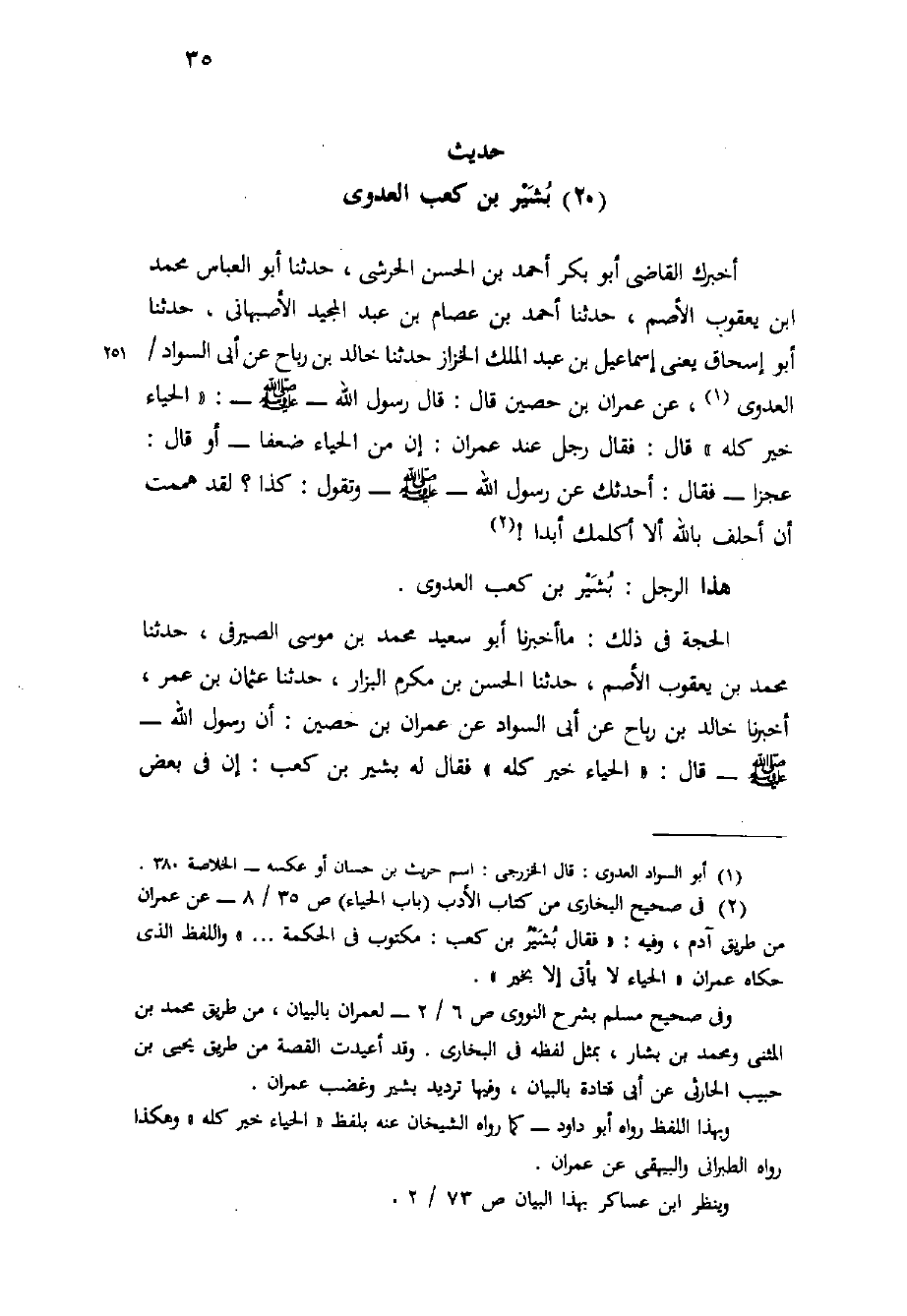أَخْبَرَكَ الْقَاضِي أَبُو بَكْرٍ أَحْمَدُ بْنُ الْحَسَنِ الْحَرْشِيُّ، حَدَّثَنَا أَبُو الْعَبَّاسِ مُحَمَّدُ ابن يَعْقُوبَ الأَصَمُّ، حَدَّثَنَا أَحْمَدُ بْنُ عِصَامِ بْن عَبْدِ الْمَجِيدِ الأَصْبَهَانِيُّ، حَدَّثَنَا أَبُو إِسْحَاقَ يَعْنِي إِسْمَاعِيلَ بْنَ عَبْدِ الْمَلِكِ الْخَزَّازَ حَدَّثَنَا خَالِدُ بْنُ رَبَاحٍ عَنْ أَبِي السَّوَادِ / الْعَدَوِيِّ، عَنْ عِمْرَانَ بْنِ حُصَيْنٍ قَالَ: قَالَ رَسُولُ اللَّهِ - صَلَّى اللَّهُ عَلَيْهِ وَسَلَّم َ -: " الْحَيَاءُ خَيْرٌ كُلُّهُ " قَالَ: فَقَالَ رَجُلٌ عِنْدَ عِمْرَانَ: إِنَّ مِنَ الْحَيَاءِ ضَعْفًا - أَوْ قَالَ: عَجْزًا - فَقَالَ: أُحَدِّثُكَ عَنْ رَسُولِ اللَّهِ - صَلَّى اللَّهُ عَلَيْهِ وَسَلَّم َ - وَتَقُولُ: كَذَا؟ لَقَدْ هَمَمْتُ أَنْ أَحْلِفَ بِاللَّهِ أَلا أُكَلِّمَكَ أَبَدًا!