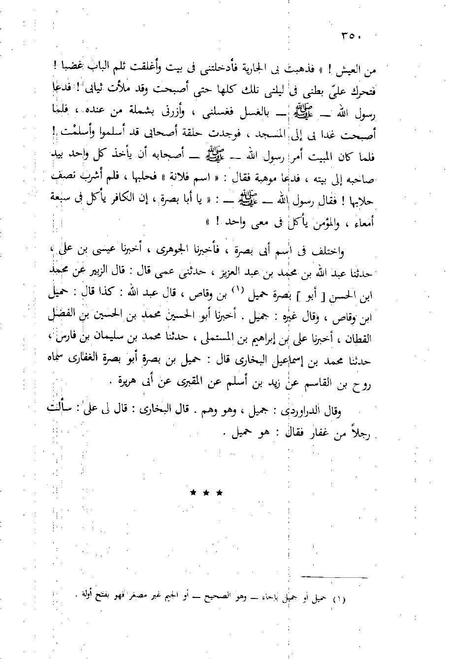 واختلف فِي اسم أَبِي بصرة، فأخبرنا الْجَوْهَرِيُّ، أَخْبَرَنَا عِيسَى بْنُ عَلِيِّ، حَدَّثَنَا عَبْدُ اللَّهِ بْنُ مُحَمَّدٍ بْنِ عَبْدِ العزيز، حَدَّثَنِي عمي قَالَ: قَالَ الزُبَيْر عن مُحَمَّد ابن الْحَسَنِ [أَبُو] بصرة حميل بْن وقاص، قَالَ عَبْد اللَّهِ: كذا قال: حميل ابن وقاص، وقَالَ غيره: جميل. أخبرنا أَبُو الْحُسَيْنِ مُحَمَّدُ بْنُ الْحُسَيْنِ بْن الْفَضْلِ الْقَطَّان، أخبرنا عليّ بْن إِبْرَاهِيمَ بْن المستملي، حَدَّثَنَا مُحَمَّدُ بْنُ سُلَيْمَان بْن فارس، حَدَّثَنَا مُحَمَّدُ بْنُ إِسْمَاعِيلَ الْبُخَارِيُّ قَالَ: حميل بْن بصرة أَبُو بصرة الغفاري سماه روح بْن الْقَاسِمِ عن زَيْد بْن أسلم عَنِ الْمَقْبَرِيِّ عَنْ أَبِي هُرَيْرَةَ.