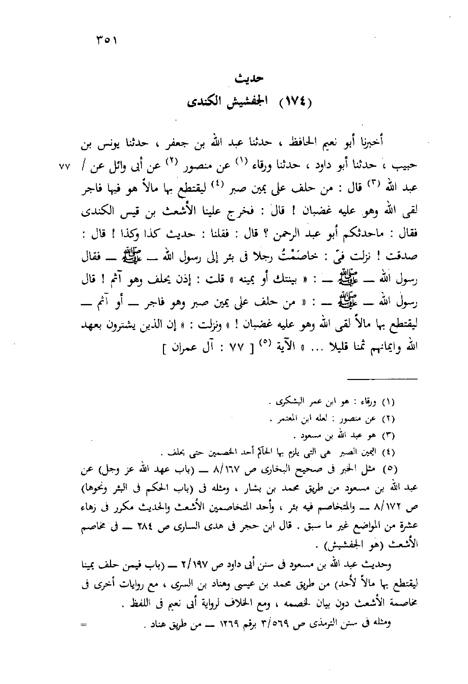 أَخْبَرَنَا أَبُو نُعَيْمٍ الْحَافِظُ، حَدَّثَنَا عَبْدُ اللَّهِ بْنُ جَعْفَرِ، حَدَّثَنَا يُونُسُ بْنُ حَبِيبٍ، حَدَّثَنَا أَبُو دَاوُدَ، حَدَّثَنَا وَرْقَاءُ عَنْ مَنْصُورٍ عَنْ أَبِي وَائِلٍ عَنْ / عَبْدِ اللَّهِ قَالَ: مَنْ حَلَفَ عَلَى يَمِينٍ صَبْرٍ لِيَقْتَطِعَ بِهَا مَالا هُوَ فِيهَا فَاجِرٌ لَقِيَ اللَّهَ وَهُوَ عَلَيْهِ غَضْبَانُ {قَالَ: فَخَرَجَ عَلَيْنَا الأَشْعَثُ بْنُ قَيْسٍ الْكِنْدِيُّ فَقَالَ: مَا حَدَّثَكُمْ أَبُو عَبْدِ الرَّحْمَنِ؟ قَالَ: فَقُلْنَا: حَدِيثَ كَذَا وَكَذَا} قَالَ: صَدَقْتَ {نَزَلَتْ فِيَّ: خَاصَمْتُ رَجُلا فِي بِئْرٍ إِلَى رَسُولِ اللَّهِ - صَلَّى اللَّهُ عَلَيْهِ وَسَلَّم َ - فَقَالَ رَسُولُ اللَّهِ - صَلَّى اللَّهُ عَلَيْهِ وَسَلَّم َ -: " بَيِّنَتُكَ أَوْ يَمِينِهِ " قُلْتُ: إِذَنْ يَحْلِفُ وَهُوَ آثِمٌ} قَالَ رَسُولُ اللَّهِ - صَلَّى اللَّهُ عَلَيْهِ وَسَلَّم َ -: " مَنْ حَلَفَ عَلَى يَمِينٍ صَبْرٍ وَهُوَ فَاجِرٌ - أَوْ آثِمٌ - لِيَقْتَطِعَ بِهَا مَالا لَقِيَ اللَّهَ وَهُوَ عَلَيْهِ غَضْبَانُ! " وَنَزَلَتْ: {إِنَّ الَّذِينَ يَشْتَرُونَ بِعَهْدِ اللَّهِ وَأَيْمَانِهِمْ ثَمَنًا قليلا} الآية [77: آل عمران] .