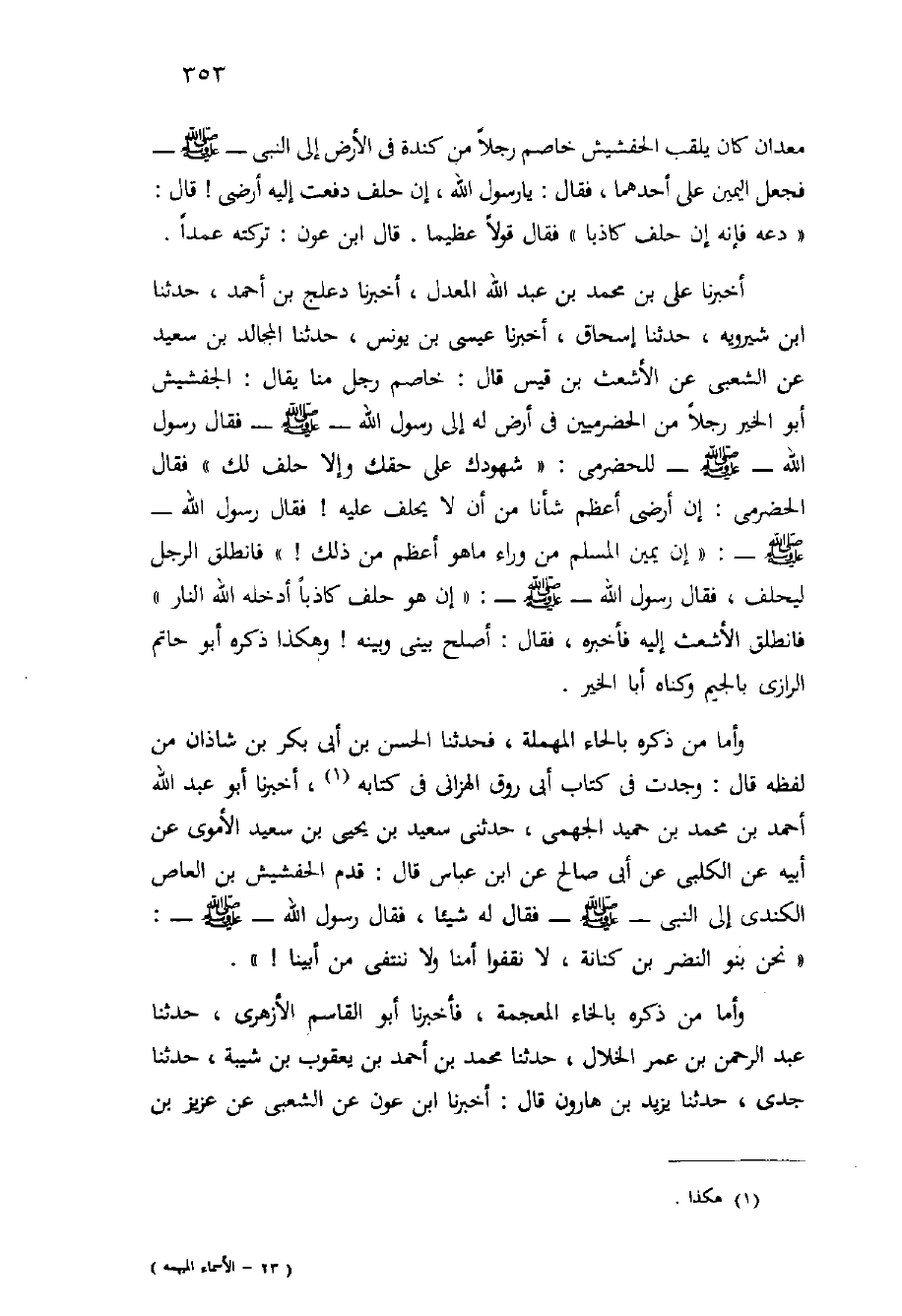أَخْبَرَنَا عَلِيُّ بْنُ مُحَمَّدِ بْنِ عَبْدِ اللَّهِ الْمُعَدَّل، أَخْبَرَنَا دَعْلَجُ بْنُ أَحْمَدَ، حَدَّثَنَا ابْنُ شِيرَوَيْهِ، حَدَّثَنَا إِسْحَاقُ، أَخْبَرَنَا عِيسَى بْنُ يُونُسَ، حَدَّثَنَا الْمُجَالِدُ بْنُ سَعِيدٍ عَنِ الشَّعْبِيِّ عَنِ الأَشْعَثَ بْنِ قَيْسٍ قَالَ: خَاصَمَ رَجُلٌ مِنَّا يُقَالُ: الْجَفْشِيشُ أَبُو الْخَيْرِ رَجُلا مِنَ الْحَضْرَمِيِّينَ فِي أَرْضٍ لَهُ إِلَى رَسُولِ اللَّهِ - صَلَّى اللَّهُ عَلَيْهِ وَسَلَّم َ - فَقَالَ رَسُولُ اللَّهِ - صَلَّى اللَّهُ عَلَيْهِ وَسَلَّم َ - لِلْحَضْرَمِيِّ: " شُهُودُكَ عَلَى حَقِّكَ وَإِلا حَلَفَ لَكَ " فَقَالَ الْحَضْرَمِيُّ: إِنَّ أَرْضِي أَعْظَمُ شَأْنًا مِنْ أَنْ لا يَحْلِفَ عَلَيْهِ} فَقَالَ رَسُولُ اللَّهِ - صَلَّى اللَّهُ عَلَيْهِ وَسَلَّم َ -: " إِنَّ يَمِينَ الْمُسْلِمِ مِنْ وَرَاءِ مَا هُوَ أَعْظَمُ مِنْ ذَلِكَ {" فَانْطَلَقَ الرَّجُلُ لِيَحْلِفَ، فَقَالَ رَسُولُ اللَّهِ - صَلَّى اللَّهُ عَلَيْهِ وَسَلَّم َ -: " إِنْ هُوَ حَلَفَ كَاذِبًا أَدْخَلَهُ اللَّهُ النَّارَ " فَانْطَلَقَ الأَشْعَثُ إِلَيْهِ فَأَخْبَرَهُ، فَقَالَ: أُصْلِحَ بَيْنِي وَبَيْنَهُ} وَهَكَذَا ذَكَرَهُ أَبُو حَاتِمٍ الرَّازِيُّ بِالْجِيمِ وَكَنَّاهُ أَبَا الْخَيْرِ.