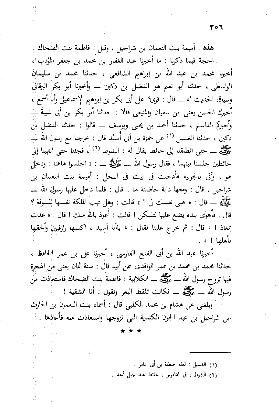 الحجة فيما ذكرنا: مَا أَخْبَرَنَا عَبْدُ الْغَفَّارِ بْنُ مُحَمَّدِ بْنِ جَعْفَرٍ الْمُؤَدِّبُ، أَخْبَرَنَا مُحَمَّدُ بْنُ عَبْدِ اللَّهِ بْنِ إِبْرَاهِيمَ الشَّافِعِيُّ، حَدَّثَنَا مُحَمَّدُ بْنُ سُلَيْمَانَ الْوَاسِطِيُّ، حَدَّثَنَا أَبُو نُعَيْمٍ هُوَ الْفَضْلُ بْنُ دُكَيْنٍ - وَأَخْبَرَنَا أَبُو بَكْرٍ الْبَرْقَانِيُّ وَسِيَاقُ الْحَدِيثِ لَهُ - قَالَ: قُرِئَ عَلَى أَبِي بَكْرِ بْنِ إِبْرَاهِيمَ الإِسْمَاعِيلِيِّ وَأَنَا أَسْمَعُ، أَخْبَرَكَ الْحَسَنُ يَعْنِي ابْنَ سُفْيَانَ وَالْمَنِيعِيَّ قَالا: حَدَّثَنَا أَبُو بَكْرِ بْنُ أَبِي شَيْبَةَ - وَأَخْبَرَكُمُ الْقَاسِمُ، حَدَّثَنَا أَحْمَدُ بْنُ يَحْيَى وَيُوسُفُ - قَالُوا: حَدَّثَنَا الْفَضْلُ بْنُ دُكَيْنٍ، حَدَّثَنَا الْغِسِّيلُ عَنْ حَمْزَةَ بْنِ أَبِي أُسَيْدٍ قَالَ: خَرَجْنَا مَعَ رَسُولِ اللَّهِ - صَلَّى اللَّهُ عَلَيْهِ وَسَلَّم َ - حَتَّى انْطَلَقْنَا إِلَى حَائِطٍ يُقَالُ لَهُ: الشَّوْطُ، فَجِئْنَا حَتَّى انْتَهَيْنَا إِلَى حَائِطَيْنِ جَلَسْنَا بَيْنَهُمَا، فَقَالَ رَسُولُ اللَّهِ - صَلَّى اللَّهُ عَلَيْهِ وَسَلَّم َ -: " اجْلِسُوا هَاهُنَا " وَدَخَلَ هُوَ، وَأُتِيَ بِالْجَوْنِيَّةِ فَأُدْخِلَتْ فِي بَيْتِ فِي النَّخْلِ: أُمَيْمَةُ بِنْتُ النُّعْمَانِ بْنِ شُرَاحِيلَ، قَالَ: وَمَعَهَا دَابَّةٌ حَاضِنَةٌ لَهَا. قَالَ: فَلَمَّا دَخَلَ عَلَيْهَا رَسُولُ اللَّهِ - صَلَّى اللَّهُ عَلَيْهِ وَسَلَّم َ - قَالَ: " هَبِي نَفْسَكِ لِي {" قَالَتْ: وَهَلْ تَهَبُ الْمَلِكَةُ نَفْسَهَا لِلسُّوقَةِ؟ قَالَ: فَأَهْوَى بِيَدِهِ يَضَعُ عَلَيْهَا لِتَسْكُنَ} قَالَتْ: أَعُوذُ بِاللَّهِ مِنْكَ {قال: " عذت بمعاذ} " قال: ثُمَّ خَرَجَ عَلَيْنَا فَقَالَ: " يَا أبا أسيد، اكسها رازقبين وَأَلْحِقْهَا بِأَهْلِهَا {".