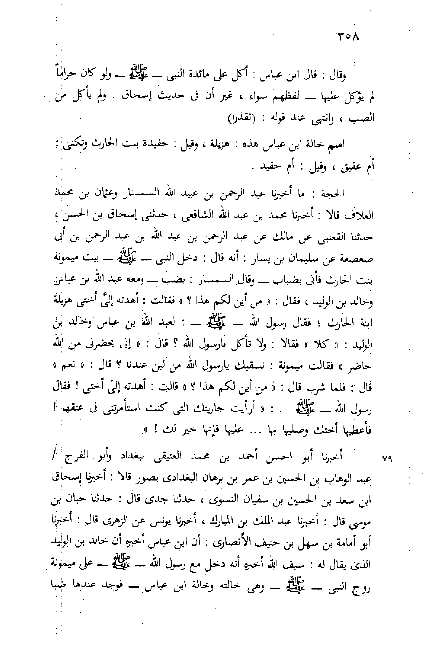 الحجة: مَا أَخْبَرَنَا عَبْدُ الرَّحْمَنِ بْنُ عُبَيْدِ اللَّهِ السِّمْسَارُ وَعُثْمَانُ بْنُ مُحَمَّدٍ الْعَلافُ قَالا: أَخْبَرَنَا مُحَمَّدُ بْنُ عَبْدِ اللَّهِ الشَّافِعِيُّ، حَدَّثَنِي إِسْحَاقُ بْنُ الْحَسَنِ، حَدَّثَنَا الْقَعْنَبِيُّ عَنْ مَالِكٍ عَنْ عَبْدِ الرَّحْمَنِ بْنِ عَبْدِ اللَّهِ بْنِ عَبْدِ الرَّحْمَنِ بْنِ أَبِي صَعْصَعَةَ عَنْ سُلَيْمَانَ بْنِ يَسَارٍ: أَنَّهُ قَالَ: دَخَلَ النَّبِيُّ - صَلَّى اللَّهُ عَلَيْهِ وَسَلَّم َ - بَيْتَ مَيْمُونَةَ بِنْتِ الْحَارِثِ فَأُتِيَ بِضِبَابٍ - وَقَالَ السِّمْسَارُ: بِضَبٍّ - وَمَعَهُ عَبْدُ اللَّهِ بْنُ عَبَّاسٍ وَخَالِدُ بْنُ الْوَلِيدِ، فَقَالَ: " مِنْ أَيْنَ لَكُمْ هَذَا؟ " فَقَالَتْ: أَهْدَتْهُ إِلَيَّ أُخْتِي هُزَيْلَةَ ابْنَةُ الْحَارِثِ؛ فَقَالَ رَسُولُ اللَّهِ - صَلَّى اللَّهُ عَلَيْهِ وَسَلَّم َ -: لِعَبْدِ اللَّهِ بْنِ عَبَّاسٍ وَخَالِدِ بْنِ الْوَلِيدِ: " كُلا " فَقَالا: وَلا تَأْكُلُ يَا رَسُولَ اللَّهِ؟ قَالَ: " إِنِّي يَحْضُرُنِي مِنَ اللَّهِ حَاضِرٌ " فَقَالَتْ مَيْمُونَةُ: نُسْقِيكَ يَا رَسُولَ اللَّهِ مِنْ لَبَنٍ عِنْدَنَا؟ قَالَ: " نَعَمْ " قَالَ: فَلَمَّا شَرِبَ قَالَ: " مِنْ أَيْنَ لَكُمْ هَذَا؟ " قَالَتْ: أَهْدَتْهُ إِلَيَّ أُخْتِي {فَقَالَ رَسُولُ اللَّهِ - صَلَّى اللَّهُ عَلَيْهِ وَسَلَّم َ -: " أَرَأَيْتِ جَارِيَتَكِ الَّتِي كُنْتِ اسْتَأْمَرْتِنِي فِي عِتْقِهَا} فَأَعْطِيهَا أُخْتَكِ وَصِلِيهَا بِهَا ... عَلَيْهَا فَإِنَّهَا خَيْرٌ لَكَ! "
