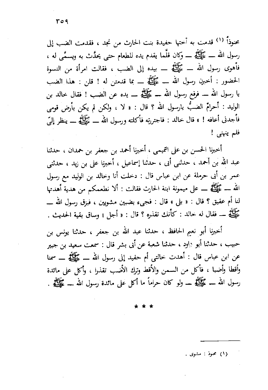 مَحْنُوذًا قَدِمَتْ بِهِ أُخْتُهَا حَفِيدَةُ بِنْتُ الْحَارِثِ مِنْ نَجْدٍ، فَقَدَّمَتِ الضَّبَّ إِلَى رَسُولِ اللَّهِ - صَلَّى اللَّهُ عَلَيْهِ وَسَلَّم َ - وَكَانَ قَلَّمَا يُقَدِّمُ يَدَهُ لِلطَّعَامِ حَتَّى يُحَدَّثَ بِهِ وَيُسَمَّى لَهُ، فَأَهْوَى رَسُولُ اللَّهِ - صَلَّى اللَّهُ عَلَيْهِ وَسَلَّم َ - بِيَدِهِ إِلَى الضَّبِّ، فَقَالَتِ امْرَأَةٌ مِنَ النِّسْوَةِ الْحُضُورِ: أَخْبِرْنَ رَسُولَ اللَّهِ - صَلَّى اللَّهُ عَلَيْهِ وَسَلَّم َ - بِمَا قَدَّمْتُنَّ لَهُ {قُلْنَ: هَذَا الضَّبُّ يَا رَسُولَ اللَّهِ - فَرَفَعَ رَسُولُ اللَّهِ - صَلَّى اللَّهُ عَلَيْهِ وَسَلَّم َ - يده عن الضَّبِّ} فَقَالَ خَالِدُ بْنُ الْوَلِيدِ: أَحَرَامٌ الضَّبُّ يَا رَسُولَ اللَّهِ؟ قَالَ: " لا، وَلَكِنْ لَمْ يَكُنْ بِأَرْضِ قَوْمِي فَأَجِدُنِي أَعَافُهُ {" قَالَ خَالِدٌ: فَاجْتَرَرْتُهُ فَأَكَلْتُهُ وَرَسُولُ اللَّهِ - صَلَّى اللَّهُ عَلَيْهِ وَسَلَّم َ - يَنْظُرُ إِلَيَّ فَلَمْ يَنْهَنِي}
