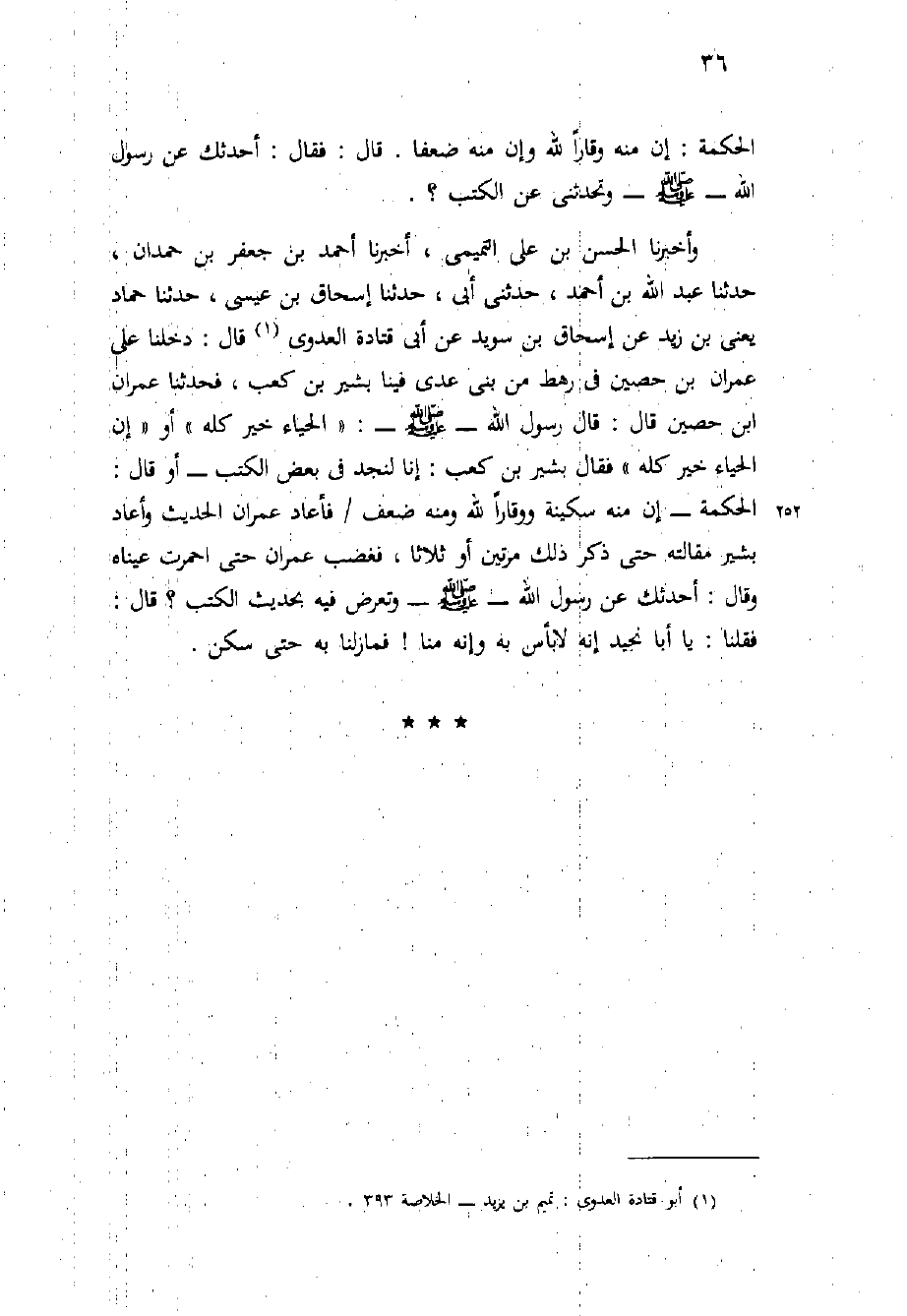 وَأَخْبَرَنَا الْحَسَنُ بْنُ عَلِيٍّ التَّمِيمِيُّ، أَخْبَرَنَا أَحْمَدُ بْنُ جَعْفَرِ بْنِ حَمْدَانَ، حَدَّثَنَا عَبْدُ اللَّهِ بْنُ أَحْمَدَ، حَدَّثَنِي أَبِي، حَدَّثَنَا إِسْحَاقُ بْنُ عِيسَى، حدثنا حماد يعني بن زَيْدٍ عَنْ إِسْحَاقَ بْنِ سُوَيْدٍ عَنْ أَبِي قَتَادَةَ الْعَدَوِيِّ قَالَ: دَخَلْنَا عَلَى عِمْرَانَ بْنِ حُصَيْنٍ فِي رَهْطٍ مِنْ بَنِي عَدِيٍّ فِينَا بَشِيرُ بْنُ كَعْبٍ، فَحَدَّثَنَا عمران ابن حُصَيْنٍ قَالَ: قَالَ رَسُولُ اللَّهِ - صَلَّى اللَّهُ عَلَيْهِ وَسَلَّم َ -: " الْحَيَاءُ خَيْرٌ كُلُّهُ " أَوْ " إِنَّ الْحَيَاءَ خَيْرٌ كُلُّهُ " فَقَالَ بَشِيرُ بْنُ كَعْبٍ: إِنَّا لَنَجِدُ فِي بَعْضِ الْكُتُبِ - أَوْ قَالَ: الْحِكَمَةَ - إِنَّ مِنْهُ سَكِينَةً وَوَقَارًا لِلَّهِ وَمِنْهُ ضَعْفٌ / فَأَعَادَ عِمْرَانُ الْحَدِيثَ وَأَعَادَ بَشِيرٌ مَقَالَتَهُ حَتَّى ذَكَرَ ذلك مرتين أو ثلاثا، فَغَضِبَ عِمْرَانُ حَتَّى احْمَرَّتْ عَيْنَاهُ وَقَالَ: أُحَدِّثُكَ عَنْ رَسُولِ اللَّهِ - صَلَّى اللَّهُ عَلَيْهِ وَسَلَّم َ - وَتَعْرِضُ فِيهِ بِحَدِيثِ الْكُتُبِ؟ قَالَ: فَقُلْنَا: يَا أَبَا نُجَيْدٍ إِنَّهُ لا بَأْسَ بِهِ وَإِنَّهُ مِنَّا! فمازلنا به حتى سكن.