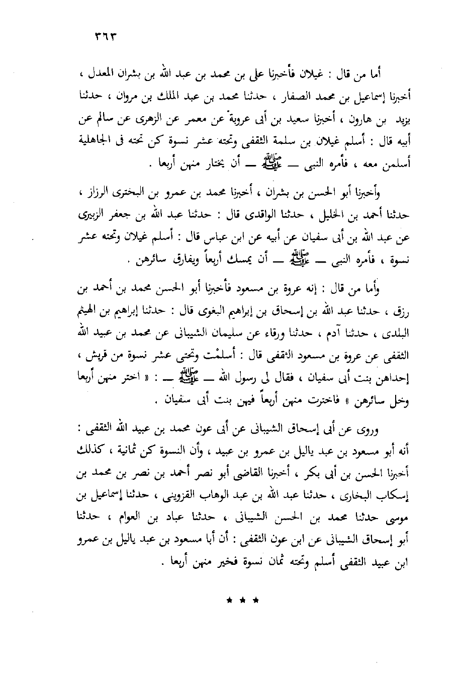 وَأَخْبَرَنَا أَبُو الْحَسَنِ بْنُ بِشْرَانِ، أَخْبَرَنَا مُحَمَّدُ بْنُ عَمْرِو بْنِ الْبَخْتَرِيِّ الرَّزَّازُ، حَدَّثَنَا أَحْمَدُ بْنُ الْخَلِيلِ، حَدَّثَنَا الْوَاقِدِيُّ قَالَ: حَدَّثَنَا عَبْدُ اللَّهِ بْنُ جَعْفَرٍ الزُّبَيْرِيُّ عَنْ عَبْدِ اللَّهِ بْنِ أَبِي سُفْيَانَ عَنْ أَبِيهِ عَنِ ابْنِ عَبَّاسٍ قَالَ: أَسْلَمَ غَيْلانُ وَتَحْتَهُ عَشْرُ نِسْوَةٍ، فَأَمَرَهُ النَّبِيُّ - صَلَّى اللَّهُ عَلَيْهِ وَسَلَّم َ - أَنْ يُمْسِكَ أَرْبَعًا وَيُفَارِقَ سَائِرَهُنَّ.