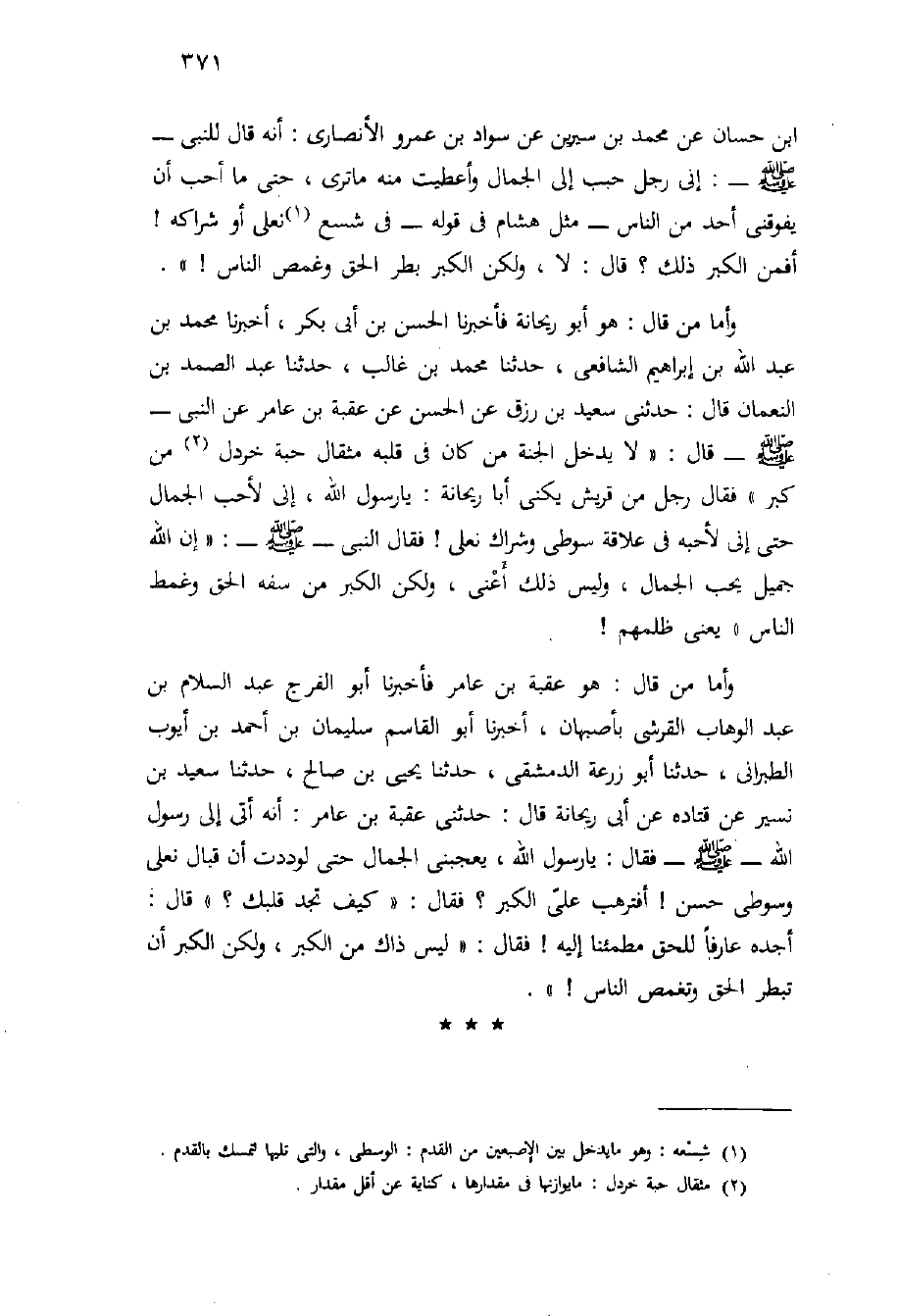 ابن حَسَّانٍ عَنْ مُحَمَّدِ بْنِ سِيرِينَ عَنْ سَوَادِ بْنِ عَمْرٍو الْأَنْصَارِيِّ: أَنَّهُ قَالَ لِلنَّبِيِّ - صَلَّى اللَّهُ عَلَيْهِ وَسَلَّم َ -: إِنِّي رَجُلٌ حُبِّبَ إِلَيَّ الْجَمَالَ وَأُعْطِيتُ مِنْهُ مَا تَرَى، حَتَّى مَا أُحِبُّ أَنْ يَفُوقَنِي أَحَدٌ مِنَ النَّاسِ - مِثْلُ هِشَامٍ فِي قَوْلِه - فِي شَسَعِ نَعْلِي أَوْ شِرَاكِهِ {أَفَمِنَ الْكِبْرِ ذَلِكَ؟ قَالَ: لا، وَلَكِنَّ الْكِبْرَ بَطَرُ الْحَقِّ وَغَمْصُ النَّاسِ} "