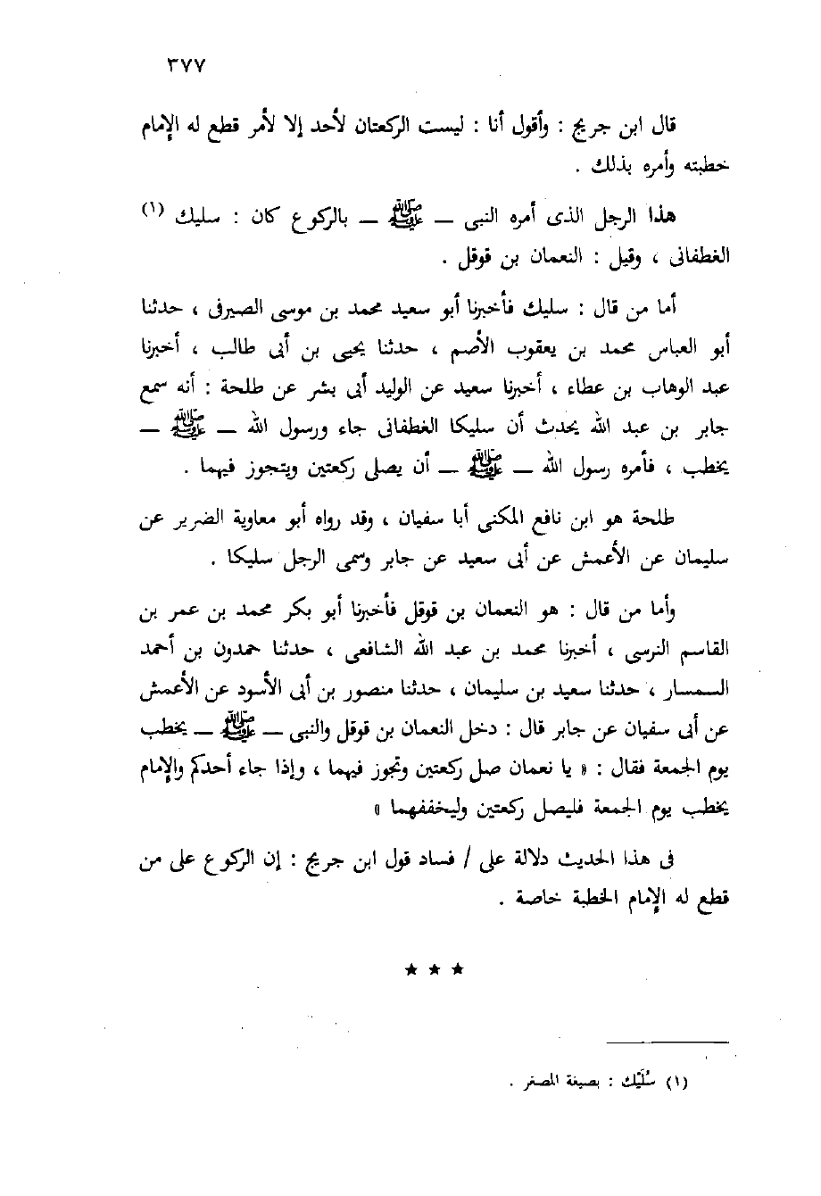 أما من قَالَ: سليك فَأَخْبَرَنَا أَبُو سَعِيدٍ مُحَمَّدُ بْنُ مُوسَى الصَّيْرَفِيُّ، حَدَّثَنَا أَبُو الْعَبَّاسِ مُحَمَّدُ بْنُ يَعْقُوبَ الأَصَمّ، حَدَّثَنَا يَحْيَى بْنُ أَبِي طَالِبٍ، أَخْبَرَنَا عَبْدُ الْوَهَّابِ بْنُ عَطَاءٍ، أَخْبَرَنَا سَعِيدٌ عَنِ الْوَلِيدِ أَبِي بِشْرٍ عَنْ طَلْحَةَ: أَنَّهُ سَمِعَ جَابِرُ بْنُ عَبْدِ اللَّهِ يُحَدِّثُ أَنَّ سُلَيْكًا الْغَطَفَانِيُّ جَاءَ وَرَسُولُ اللَّهِ - صَلَّى اللَّهُ عَلَيْهِ وَسَلَّم َ - يَخْطُبُ، فَأَمَرَهُ رَسُولُ اللَّه - صَلَّى اللَّهُ عَلَيْهِ وَسَلَّم َ - أَنْ يُصَلِّيَ رَكْعَتَيْنِ وَيَتَجَوَّزُ فِيهِمَا.