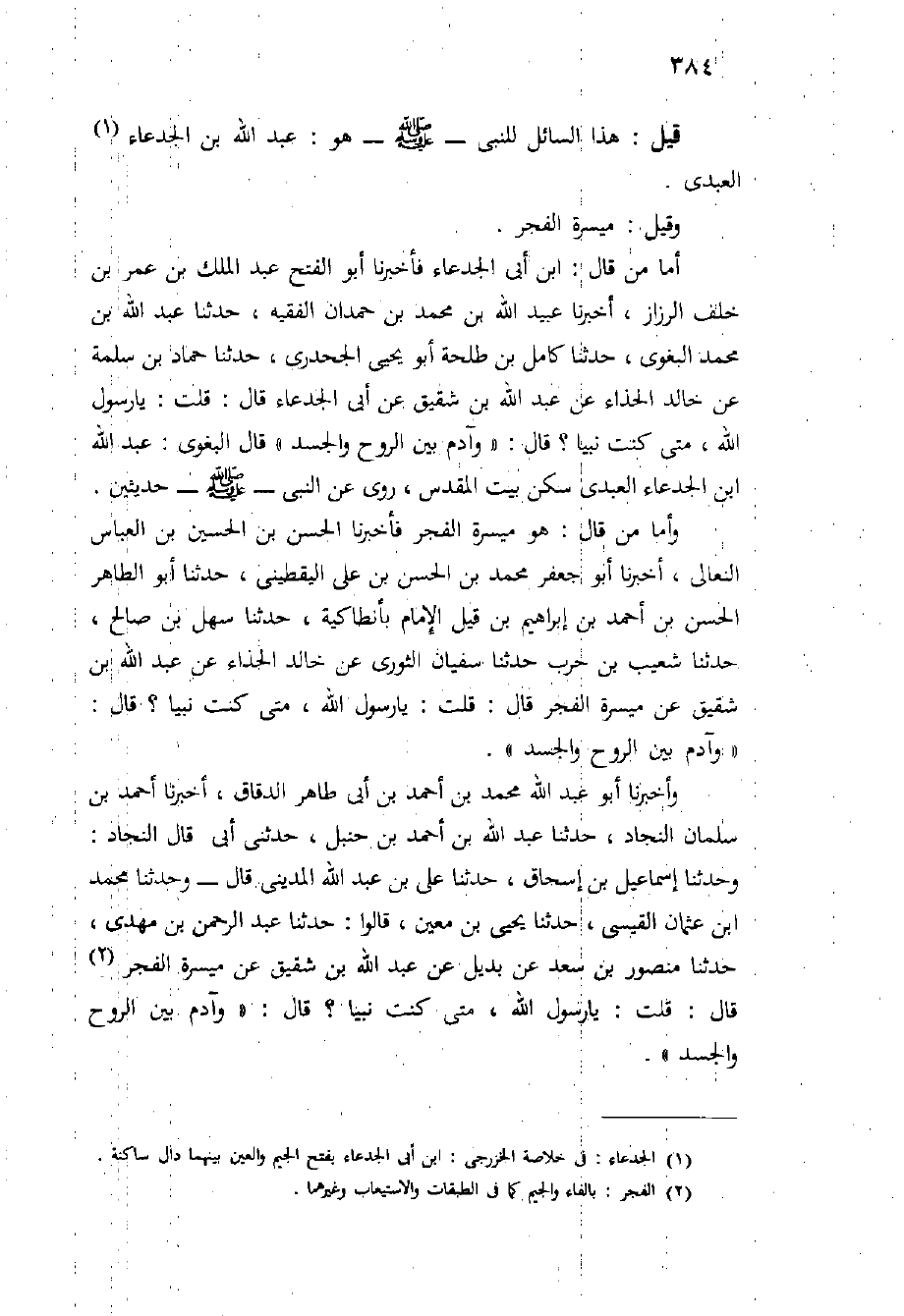 وَأَخْبَرَنَا أَبُو عَبْدِ اللَّهِ مُحَمَّدُ بْنُ أَحْمَدَ بْنِ أَبِي طَاهِرٍ الدَّقَّاقُ، أَخْبَرَنَا أَحْمَدُ بْنُ سَلْمَانَ النَّجَّادُ، حَدَّثَنَا عَبْدِ اللَّهِ بْنِ أَحْمَدَ بْنِ حَنْبَلٍ، حَدَّثَنِي أَبِي قَالَ النَّجَّادُ: وَحَدَّثَنَا إِسْمَاعِيلُ بْنُ إِسْحَاقَ، حَدَّثَنَا عَلِيُّ بْنُ عَبْدِ اللَّهِ الْمَدِينِيُّ قال - وحدثنا محمد ابن عُثْمَانَ الْقَيْسِيُّ، حَدَّثَنَا يَحْيَى بْنُ مَعِينٍ، قَالُوا: حَدَّثَنَا عَبْدُ الرَّحْمَنِ بْن مَهْدِيٍّ، حَدَّثَنَا مَنْصُورُ بْنُ سَعْدٍ عَنْ بُدَيْلٍ عَنْ عَبْدِ اللَّهِ بْنِ شَقِيقٍ عَنْ مَيْسَرَةَ الْفَجْرِ قَالَ: قُلْتُ: يَا رَسُولَ اللَّهِ، مَتَى كُنْتَ نَبِيًّا؟ قَالَ: " وآدم بين الروح والجسد ".