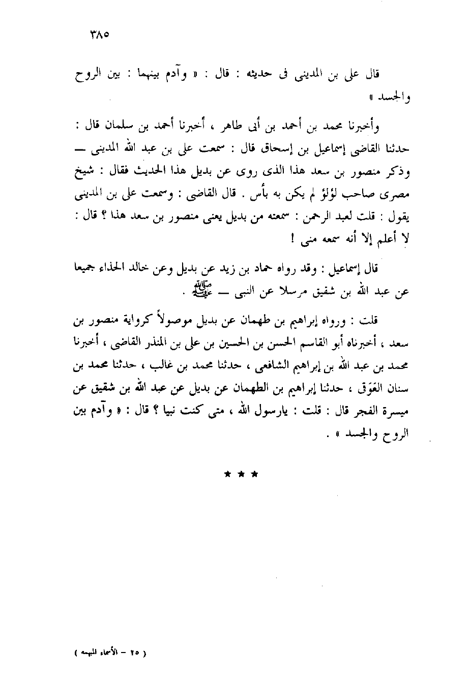 قَالَ عليّ بْن المديني فِي حديثه: قَالَ: " وآدم بَيْنَهُما: بين الروح والجسد ".