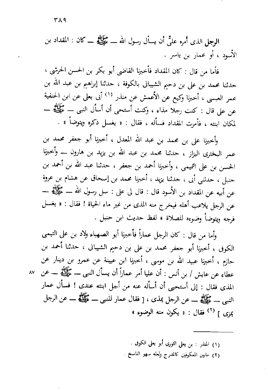 فأمَّا من قَالَ: كَانَ المقداد فَأَخْبَرَنَا الْقَاضِي أَبُو بَكْرِ بْنُ الْحَسَنِ الْحَرَشِيُّ، حَدَّثَنَا مُحَمَّدُ بْنُ عَلِيِّ بْنِ دُحَيْمٍ الشَّيْبَانِيُّ بِالْكُوفَةِ، حَدَّثَنَا إِبْرَاهِيمُ بْنُ عَبْدِ اللَّهِ بْنِ عُمَرَ الْعَبْسِيُّ، أَخْبَرَنَا وَكِيعٌ عَنِ الأَعْمَشِ عَنْ مُنْذِرٍ أَبِي يَعْلَى عَنِ ابْنِ الْحَنَفِيَّةِ عَنْ عَلِيٍّ قَالَ: كُنْتُ رَجُلا مَذَّاءً، وَكُنْتُ أَسْتَحِي أَنْ أَسْأَلَ النَّبِيَّ - صَلَّى اللَّهُ عَلَيْهِ وَسَلَّم َ - لِمَكَانِ ابْنَتِهِ، فَأَمَرْتُ الْمِقْدَادَ فَسَأَلَهُ، فَقَالَ: " يَغْسِلُ ذَكَرَهُ وَيَتَوَضَّأُ ".