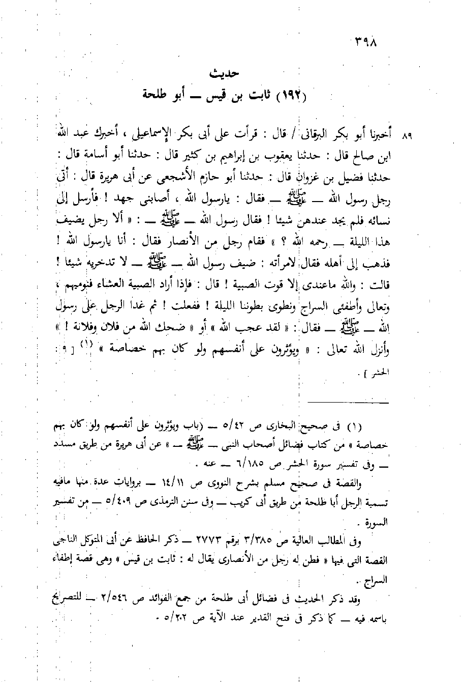 أَخْبَرَنَا أَبُو بَكْرٍ الْبَرْقَانِيُّ / قَالَ: قَرَأْتُ عَلَى أَبِي بَكْرٍ الإِسْمَاعِيلِيُّ، أَخْبَرَكَ عَبْدُ الله ابن صَالِحٍ قَالَ: حَدَّثَنَا يَعْقُوبُ بْنُ إِبْرَاهِيمَ بْنِ كَثِيْرٍ قَالَ: حَدَّثَنَا أَبُو أُسَامَةَ قَالَ: حَدَّثَنَا فُضَيْلُ بْنُ غَزْوَانَ قَالَ: حَدَّثَنَا أَبُو حَازِمٍ الأَشْجَعِيُّ عَنْ أَبِي هُرَيْرَةَ قَالَ: أَتَى رَجُلٌ رَسُولَ اللَّهِ - صَلَّى اللَّهُ عَلَيْهِ وَسَلَّم َ - فَقَالَ: يَا رَسُولَ اللَّهِ، أَصَابَنِي جَهْدٌ {فَأَرْسَلَ إِلَى نِسَائِهِ فَلَمْ يَجِدْ عِنْدَهُنَّ شَيْئًا} فَقَالَ رَسُولُ اللَّهِ - صَلَّى اللَّهُ عَلَيْهِ وَسَلَّم َ -: " أَلا رَجُلٌ يُضَيِّفُ هَذَا اللَّيْلَةَ - رَحِمَهُ اللَّهُ؟ " فَقَامَ رَجُلٌ مِنَ الأَنْصَارِ فَقَالَ: أَنَا يَا رَسُولَ اللَّهِ {فَذَهَبَ إِلَى أَهْلِهِ فَقَالَ لامْرَأَتِهِ: ضَيْفُ رَسُولِ اللَّهِ - صَلَّى اللَّهُ عَلَيْهِ وَسَلَّم َ - لا تَدَّخِرِيهِ شَيْئًا} قَالَتْ: وَاللَّهِ مَا عِنْدِي إِلا قُوتُ الصِّبْيَةِ {قَالَ: فَإِذَا أَرَادَ الصِّبْيَةُ الْعَشَاءَ فَنَوِّمِيهُمْ، وَتَعَالِي وَأَطْفِئِي السِّرَاجَ وَنَطْوِي بُطُونَنَا اللَّيْلَةَ} فَفَعَلَتْ {ثُمَّ غَدَا الرَّجُلُ عَلَى رَسُولِ اللَّهِ - صَلَّى اللَّهُ عَلَيْهِ وَسَلَّم َ - فَقَالَ: " لَقَدْ عَجِبَ اللَّهُ " أَوْ " ضَحِكَ اللَّهُ مِنْ فُلانٍ وَفُلانَةَ} " وَأَنْزَلَ اللَّهُ تَعَالى: {وَيُؤْثِرُونَ عَلَى أَنْفُسِهِمْ وَلَوْ كَانَ بِهِمْ خَصَاصَةٌ} [9: الحشر] .